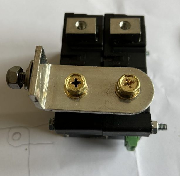 Nåväl i dag var det dags att byta ut den provisoriska lösningen med ett skiljerelä inkopplat. Se tidigare inlägg. Jag hade funderat på kopplingen av relä, kablar och ström-sensorer och kommit på att jag kunde eliminera en kabel genom att sätta en busbar mellan polerna på relät.