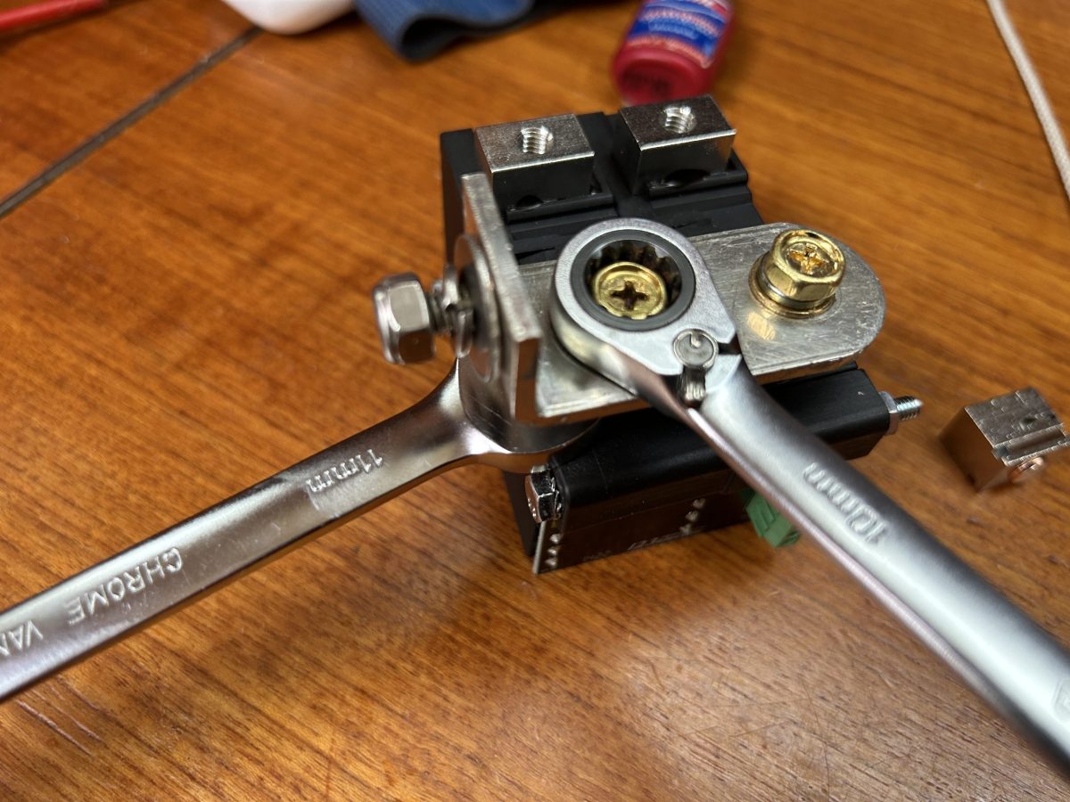 När jag drar fast kablarna så tar jag ett mothåll med en 11m nyckel så att inte polblecket skall skadas. Jag lägger också en droppe Loctite på gängorna för att inte kablarna skall lossna igen.
