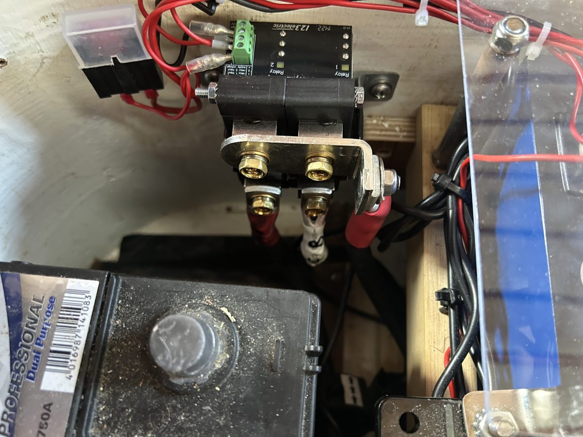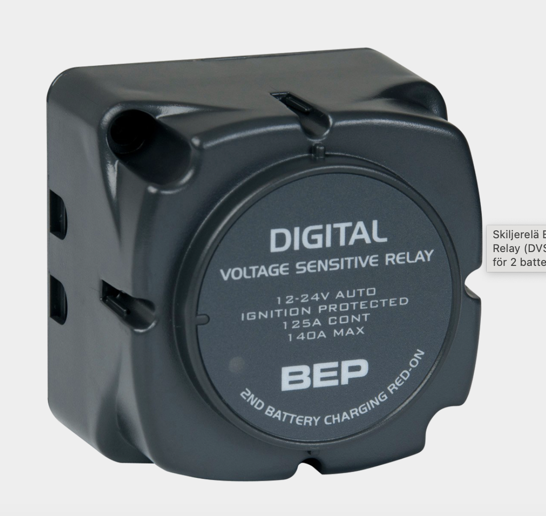 Jag funderade över vad vi hade för alternativ. Det simplaste var att strunta i relät och i stället låta BMS;en aktivera en summer om något onormalt skulle inträffa med batterierna. Men så kom jag på att vi hade ett Skiljerelä som jag nyligen fått till baks av en seglarkompis (som monterade DC/DC laddare). Det skiljerelät av märket BEP är egentligen spänningsstyrt att aktiveras vid 13,4V och stänga av vid 12,8V. MEN… om man klipper en bygel på baksidan så kan man koppla det över tändningsnyckeln och på så sätt styra reläet. Det tål 120A kontinuerligt och 140A i peak. Då kunde ju det ersätta det trasiga och styras av BMS;en. BMS;en har normalt en styr-plus ut när allt är normalt så den kunde ju ersätta styrningen från tändningslåset.