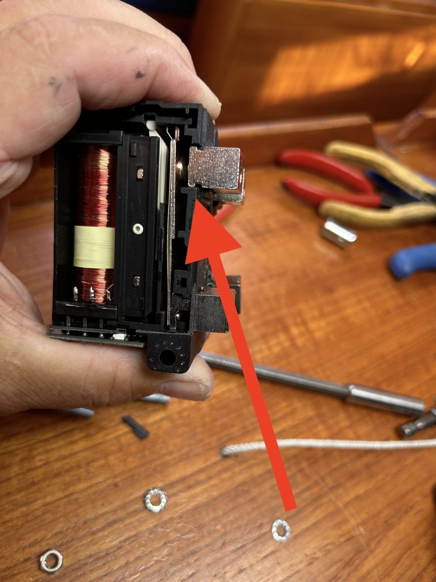 Det trasiga relät dissekerades och föll delvis isär under demonteringen. Det visar sig att den ena polen på reläkontakten endast sitter fast i en slits i plasten. Här finns risk att dra sönder polen då polskruven dras åt.