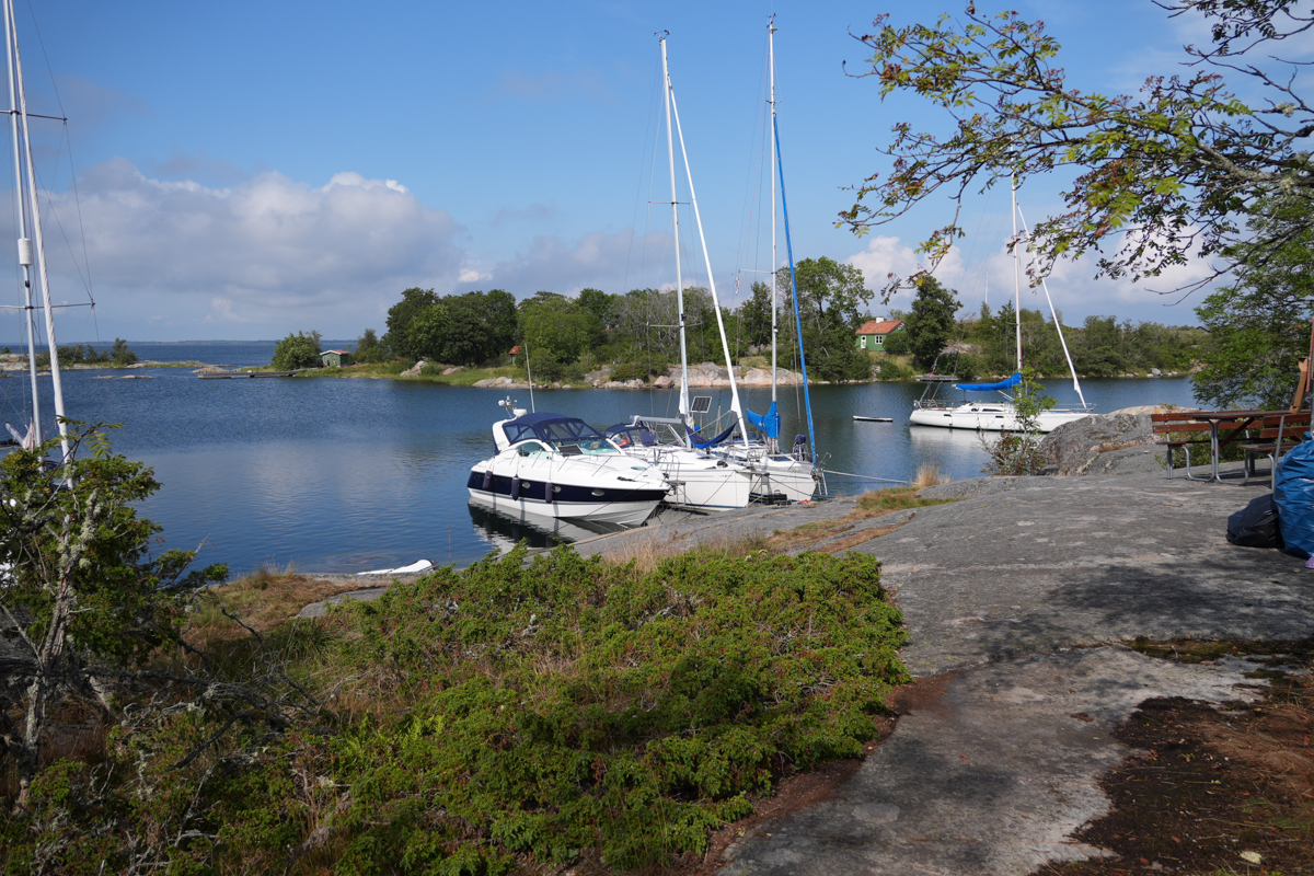 När vi kommer ligger redan en båt på svaj men viken är stor och många fler båtar får plats. Det kommer också fler båtar som lägger sig i viken.