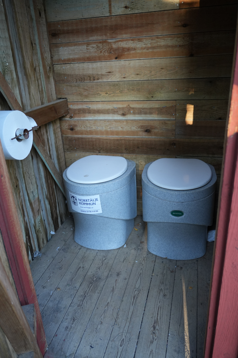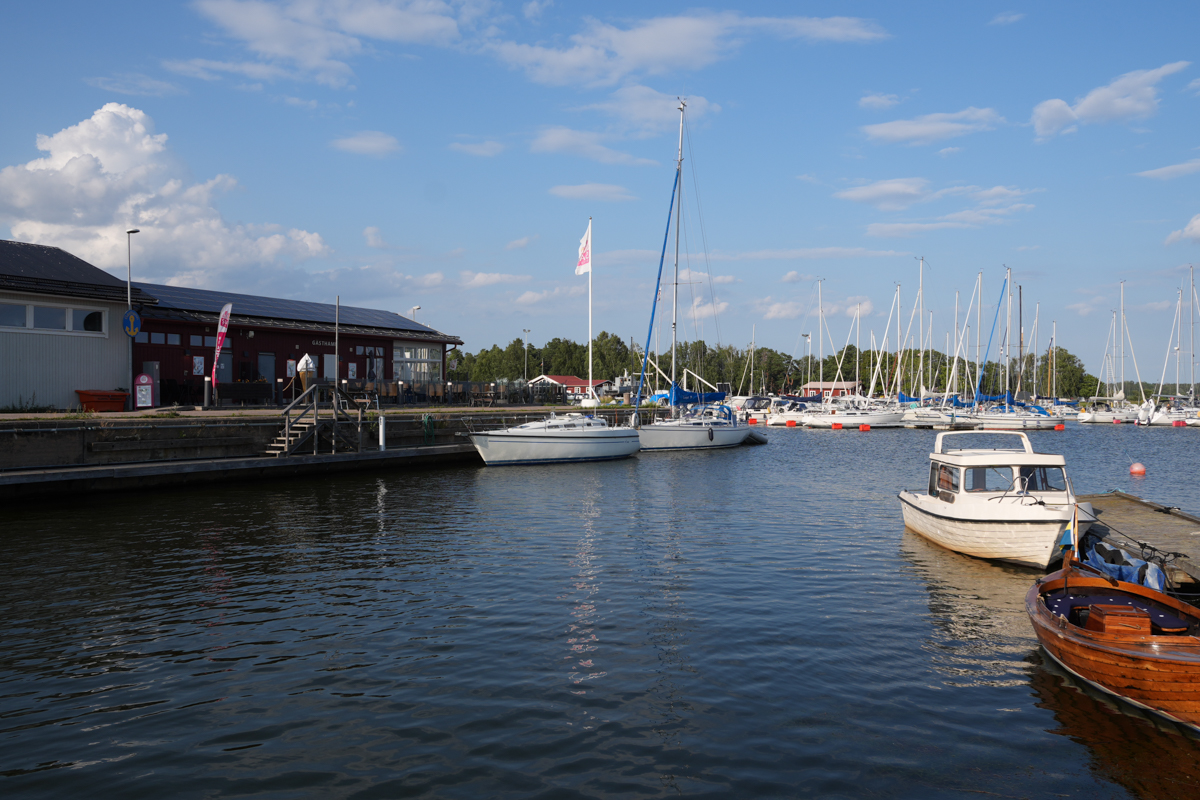 Första stoppet är vid den gamla marinan där det numera är en sjömack, bryggan ligger längst in i viken och tappen har en jättelång slang, men det är nästan så att den inte räcker ut till Amerona så vi får dra in henne jättelångt. Gästhamnen är inte ens halvfull så vi hittar en bra plats nära servicehuset. Man betalar genom att läsa in en QR kod i mobilen och swisha. 300 kronor inklusive el kostar kalaset. När vi fyllt vatten och satt i elsladden packar vi varsin väska och går till det fräscha servicehuset. Efter tio dagar med lite för kallt vatten i havet för att bada mer än ett snabbt dopp och bara en dusch i sittbrunnen när vi hade gott om varmvatten i veckan känns det underbart att låta vattnet, tvålen och schampot rinna över kroppen.