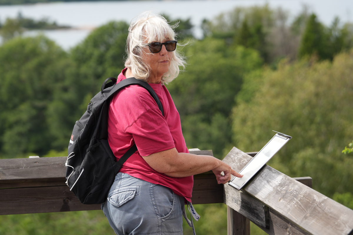 Ewa vid båken. Kollar utsikt och informationstavlan