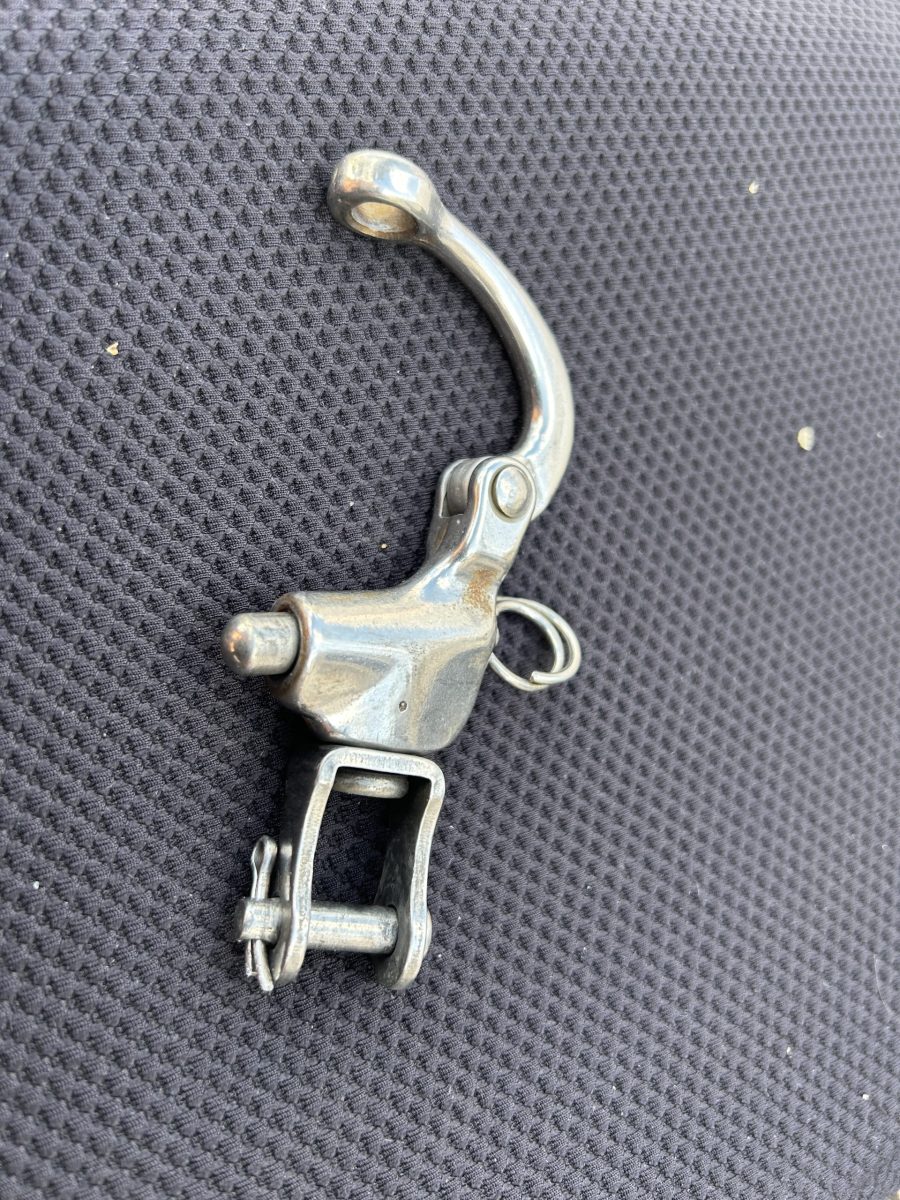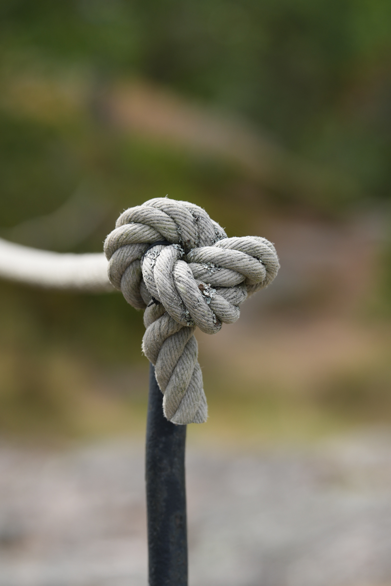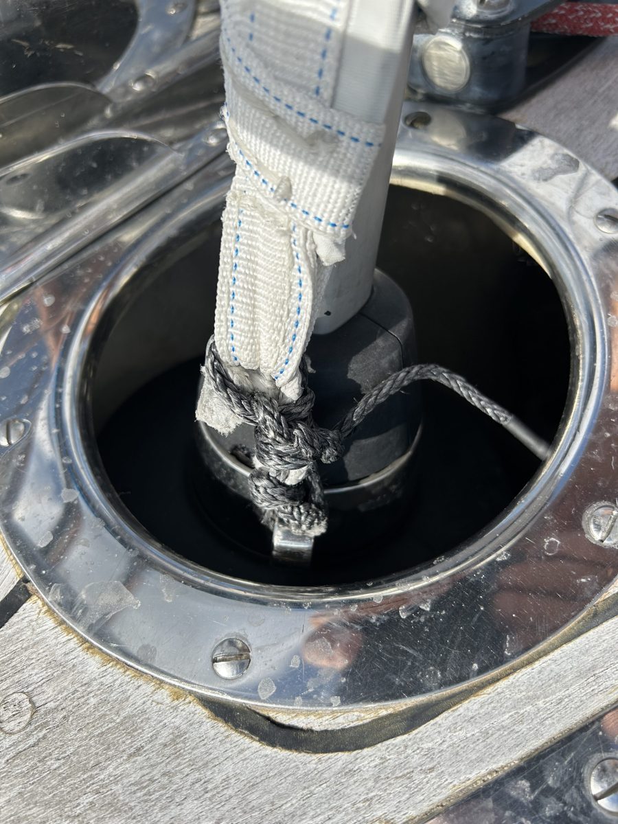 Skarven är tillräckligt stark för att hissa ett segel och löper lätt genom blocket vid mastfoten. Nu kan du lägga undan den avkapade delen när seglet är uppe. När seglet skall tas ned så tar du fram den lösa delen och kopplar ihop de båda. Om du inte gjort taglingen för tjock (som på bilden) så kan du dra skarven genom avlastaren. Annars får du skarva ihop framför avlastaren.