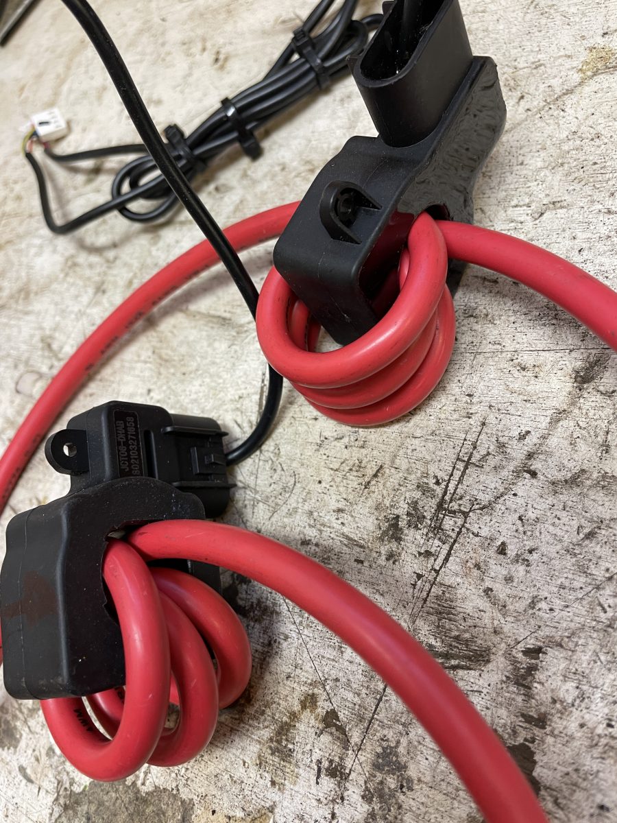 Sagt och gjort. Alla kablar var nu bortkopplade och vi började koppla om till det nya relät. Laddkabeln mellan relä och batteri var inte så grov därför att den var lindad tre varv runt en strömsensor. Detta för att få högsta noggrannhet.