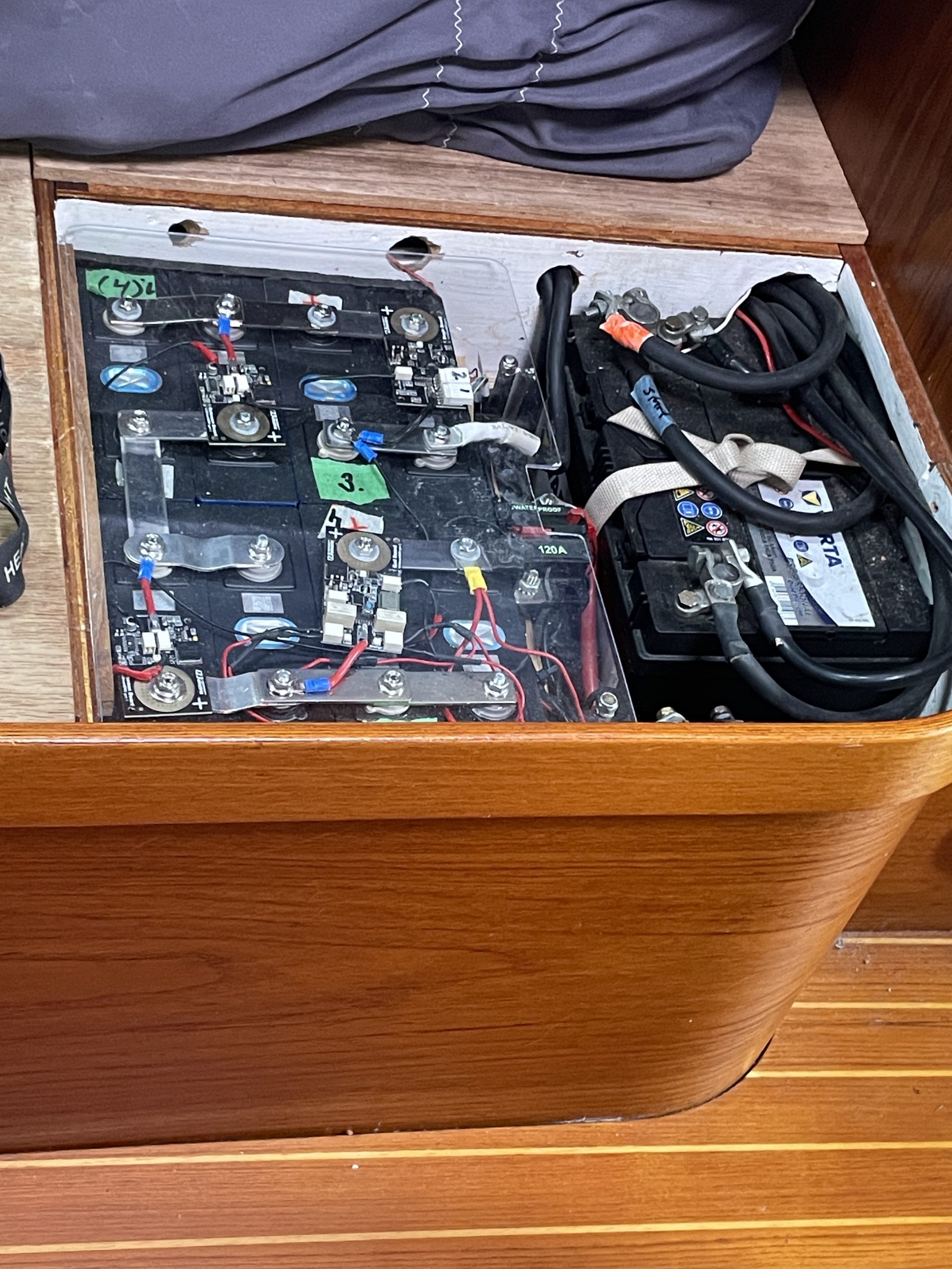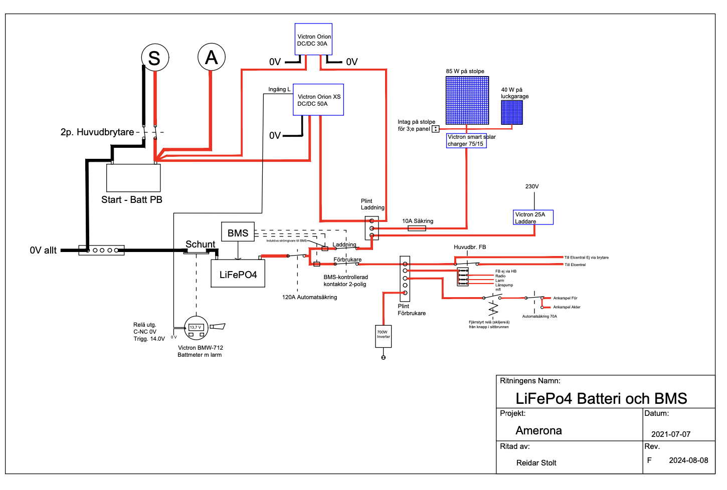 Då upptäckte jag vad som var fel! Det sitter ett dubbelrelä i boxen som styrs av BMS;en. Jag har inte en BMS där strömmen passerar genom utan BMS;en styr ett dubbelrelä. I det ena relät passerar alla laddning TILL batterierna och i det andra relät passerar alla förbrukarström. BMS;en styr reläerna efter behov. Normalt är båda reläerna till.