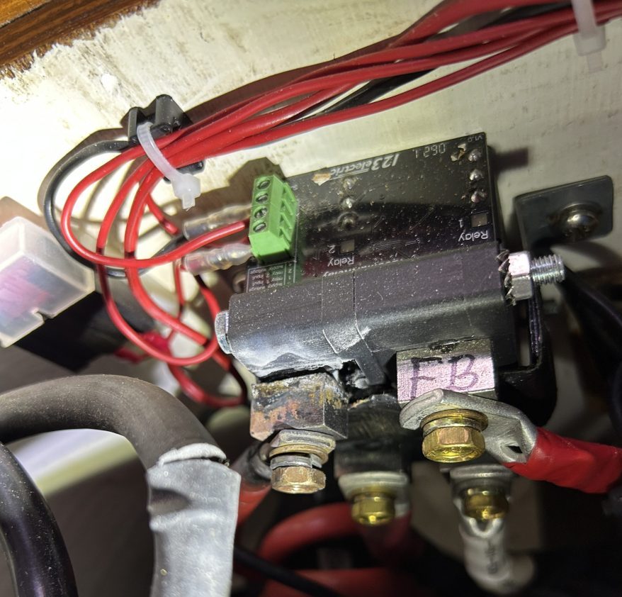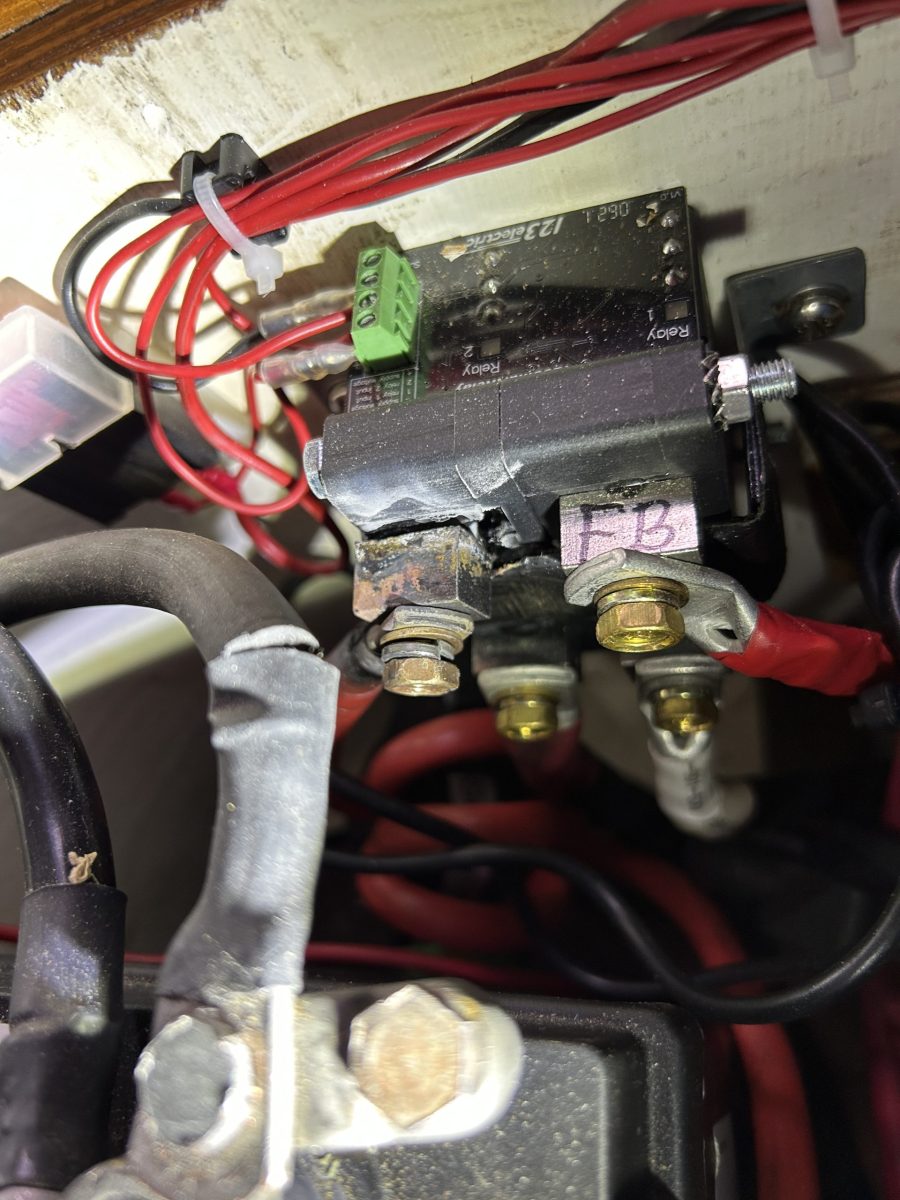 Den ena skruven på laddningskabeln var loss. Trots åtdragen med bricka + fjäderbricka. Där hade det blivit övergångsresistans och värmeutveckling. Reläets plasthölje hade smält. Men det fungerade fortfarande!?