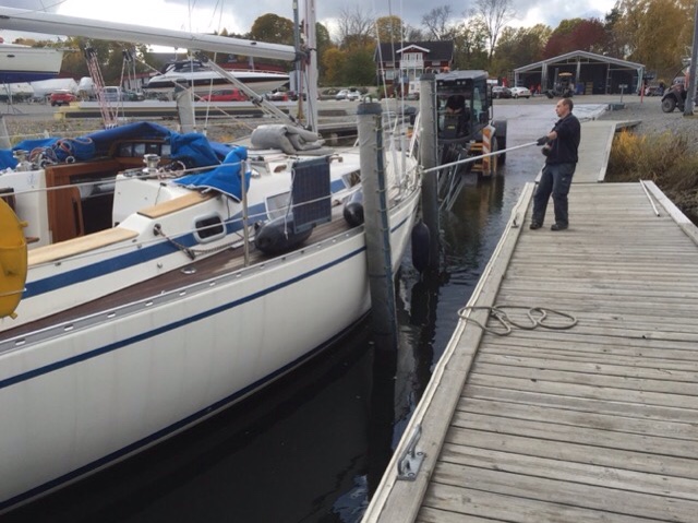 Efter en snabblunch på korv med bröd var det dags att åka in till bryggan för upptagning. Det var en båt före men det visade sig att han inte skulle ta upp utan bara tömma båten. Stax kom en båt till men vi klarade ut ordningen. Sedan tog varvets personal över. Det var bara att titta på.