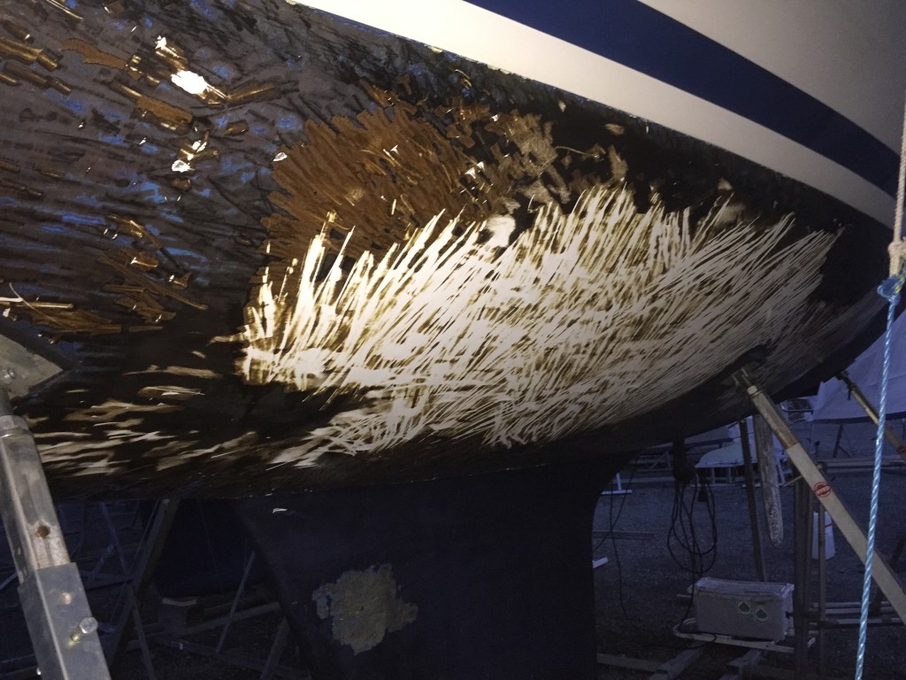 Bästa metoden är ett lånat verktyg i form av en ”barkspade”. Ett slipat maskinstål fäst på ett kvastskaft. Då får jag bort de tre lagren med blå bottenfärg. Sedan får man gå över med en vanlig skrapa och ta bort VC-17 och tjärepoxin. En del anser att botten måste vara helt plastren. Men vi får se…