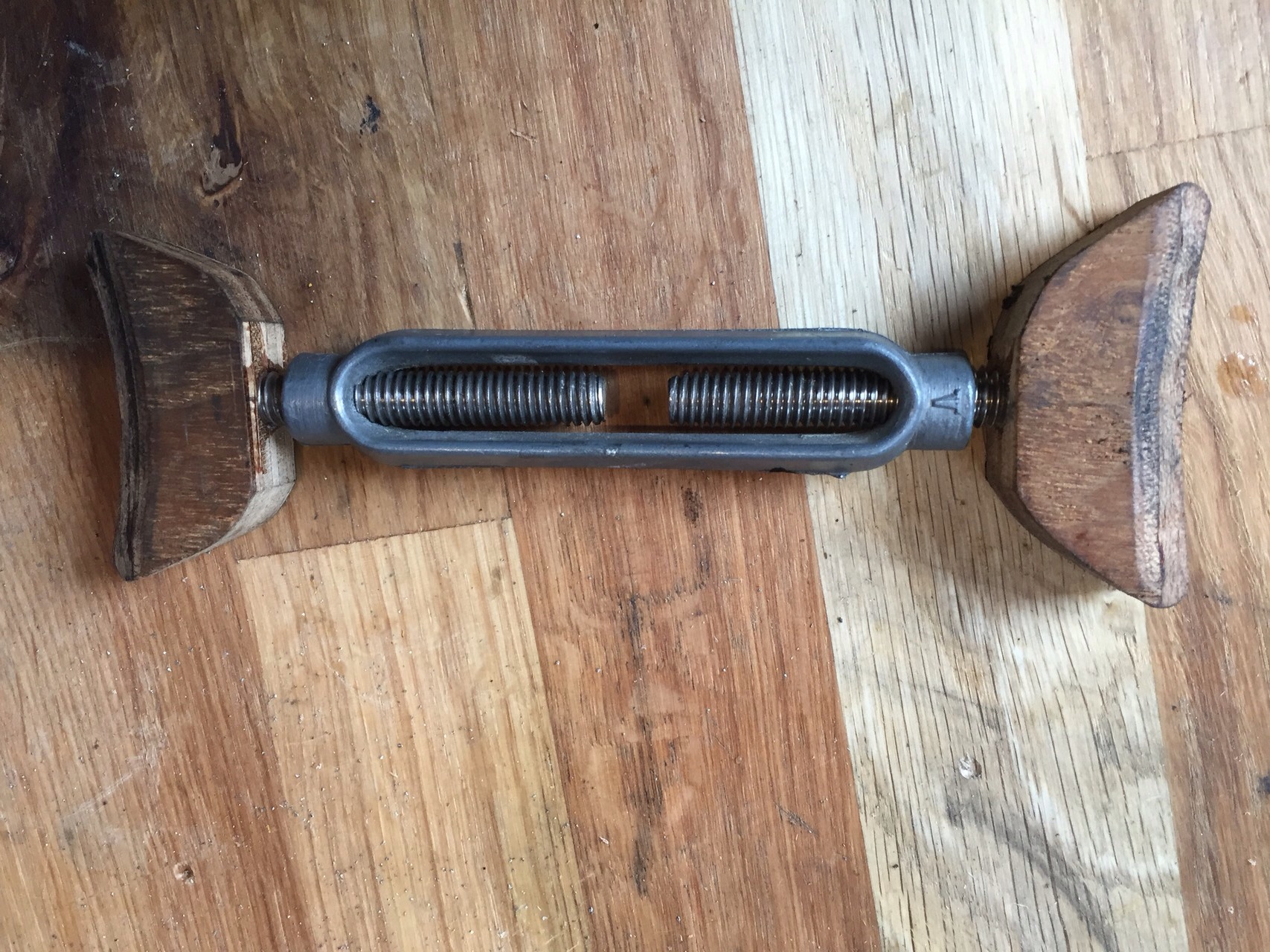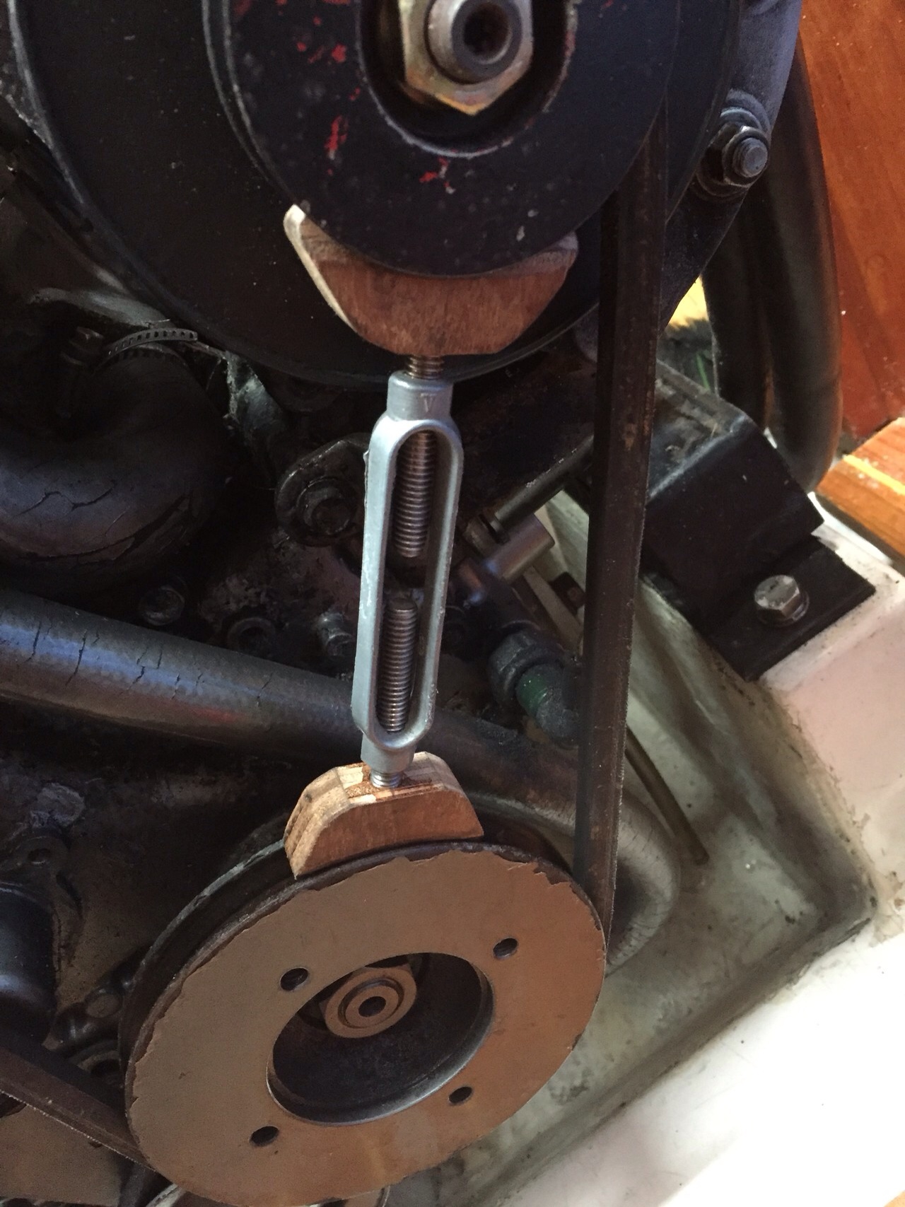 Efter en rejäl motortvätt och allmän städning så var resultatet fullgott. Återstod byte av bränslefilter och kontroll av impeller. Remmarna var i bra skick men dåligt spända. Här kom mitt gamla egenhändigt tillverkade verktyg till pass. En mycket simpel vantskruv med två plywoodbitar.