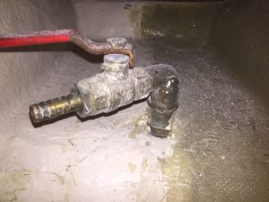 När man tar bort den gamla kranen kan man göra på två sätt. Antingen skruva av kranen från bottengenomföringen eller som här från vinkeln och sist skruva bort muttern från genomföringen.
