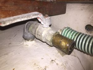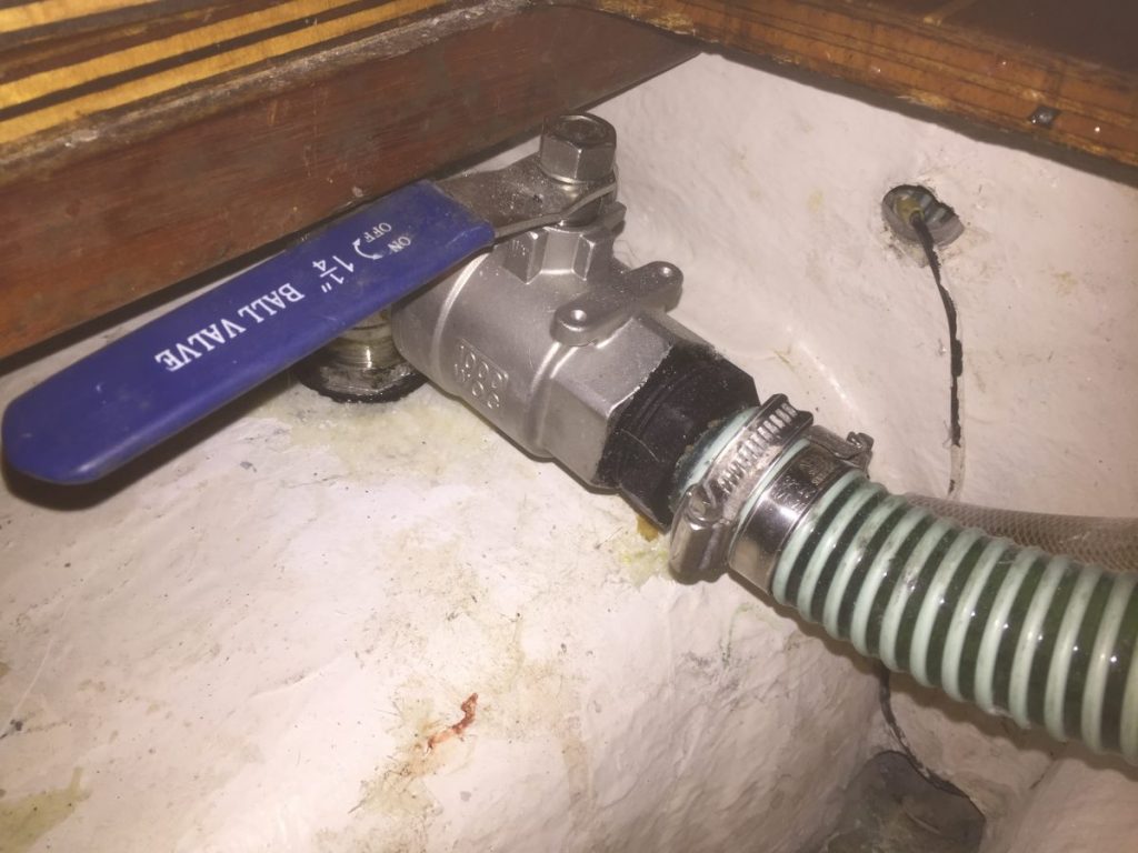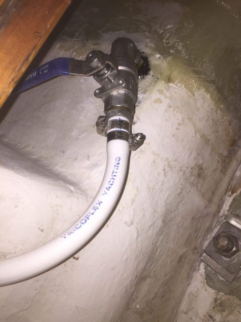 Kvar i kölsvinet är intag för sjövatten och utlopp från vasken. Som också är utlopp för länsen till duschutrymmet. Det är en klar fördel att dessa två är på varsin sida om kölen. Annars är det stor risk att det man släpper ut ur diskhon kommer till baks in i vattenintaget.