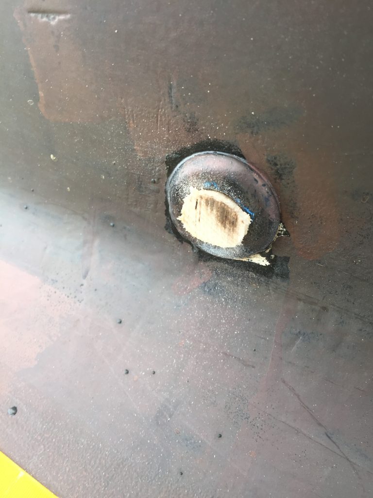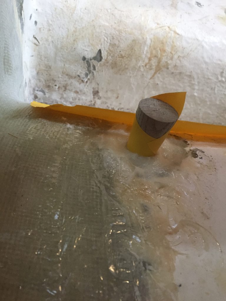 Sedan slipade jag lite på insidan och lade lite epoxi-spackel för att få en plan yta för muttern. En träplugg med tejp i hålet och sedan lite egenblandat epoxi-spackel runt om.