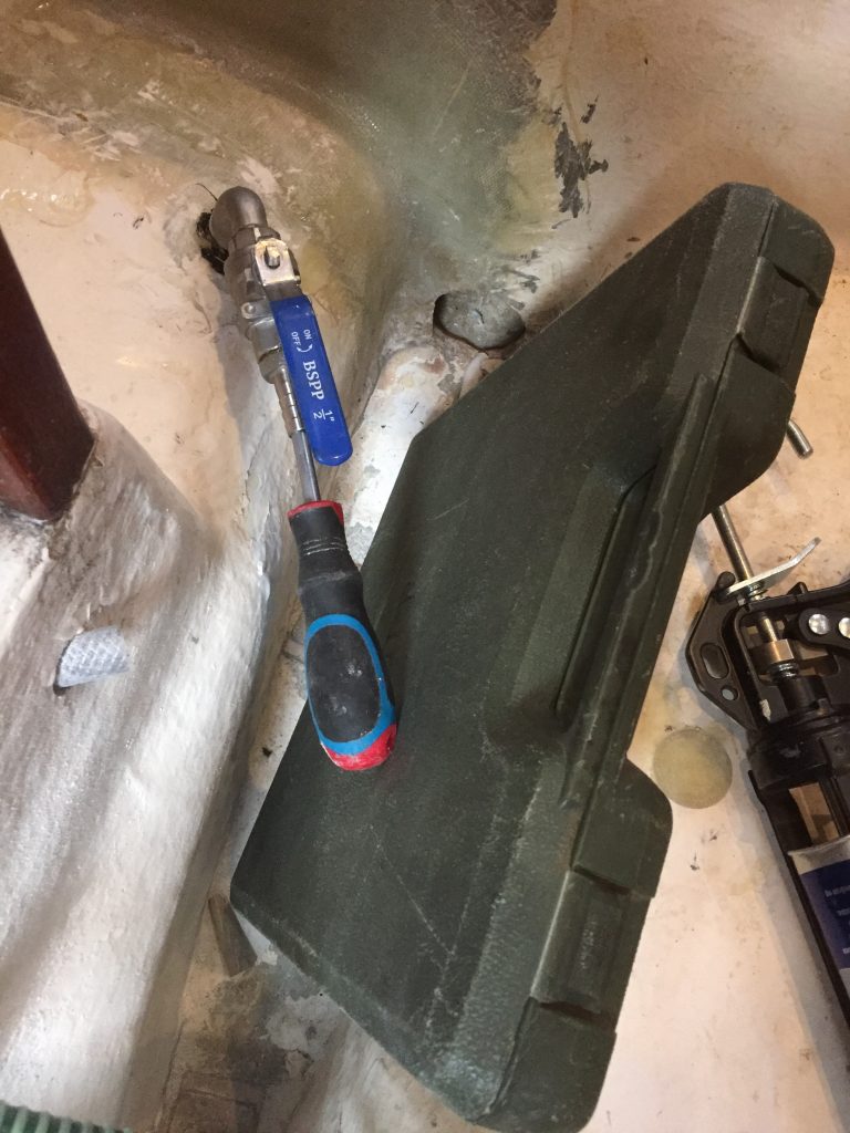 En kran i kölsvinet har redan tagits bort. Den var intaget för toaletten och när jag satte in elektrisk toalett förra året så behövdes inte intaget längre.
