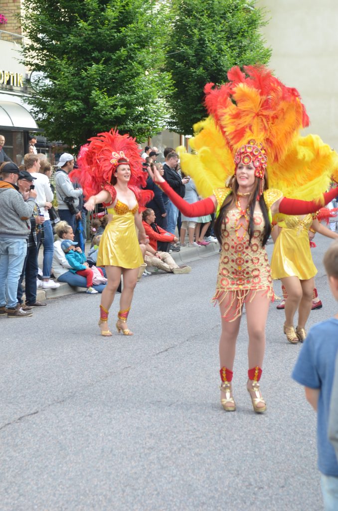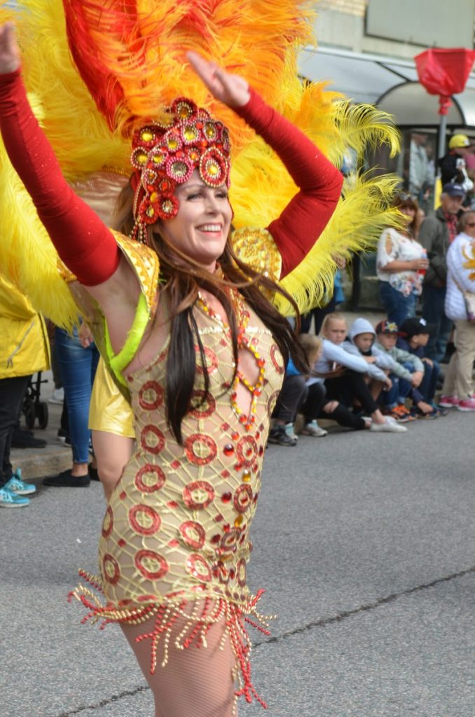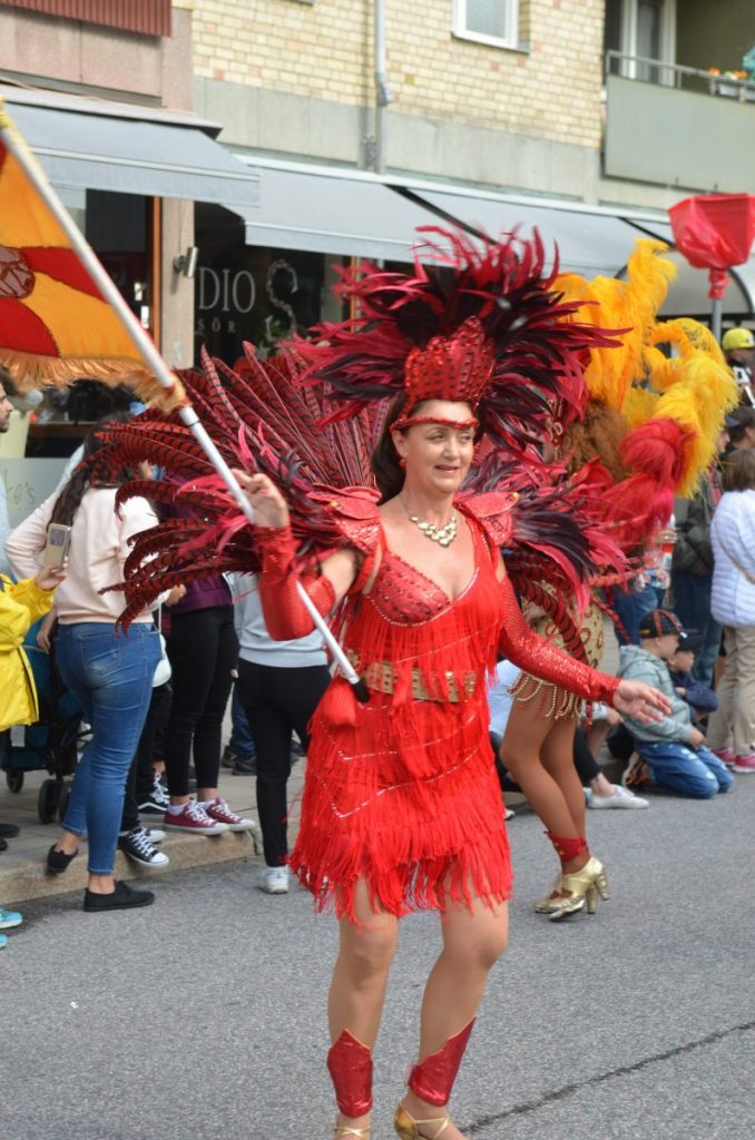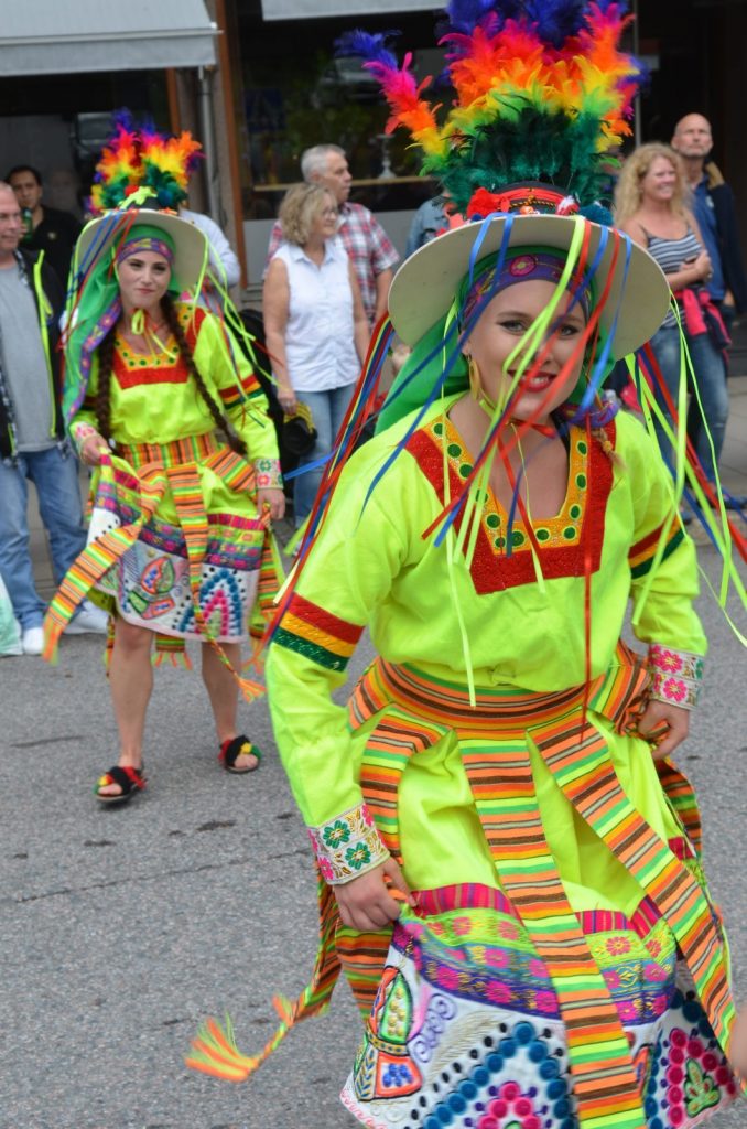 15:45 kommer det regn. Precis som utlovat. Vi tar plats efter huvudgatan i en port i skydd för regnet. Som ett trollslag så slutar det regna prick 16. Vi hör tåget på avstånd med starka trummor. Under cirka en timme går tåget genom stan med olika musik och dansgrupper.