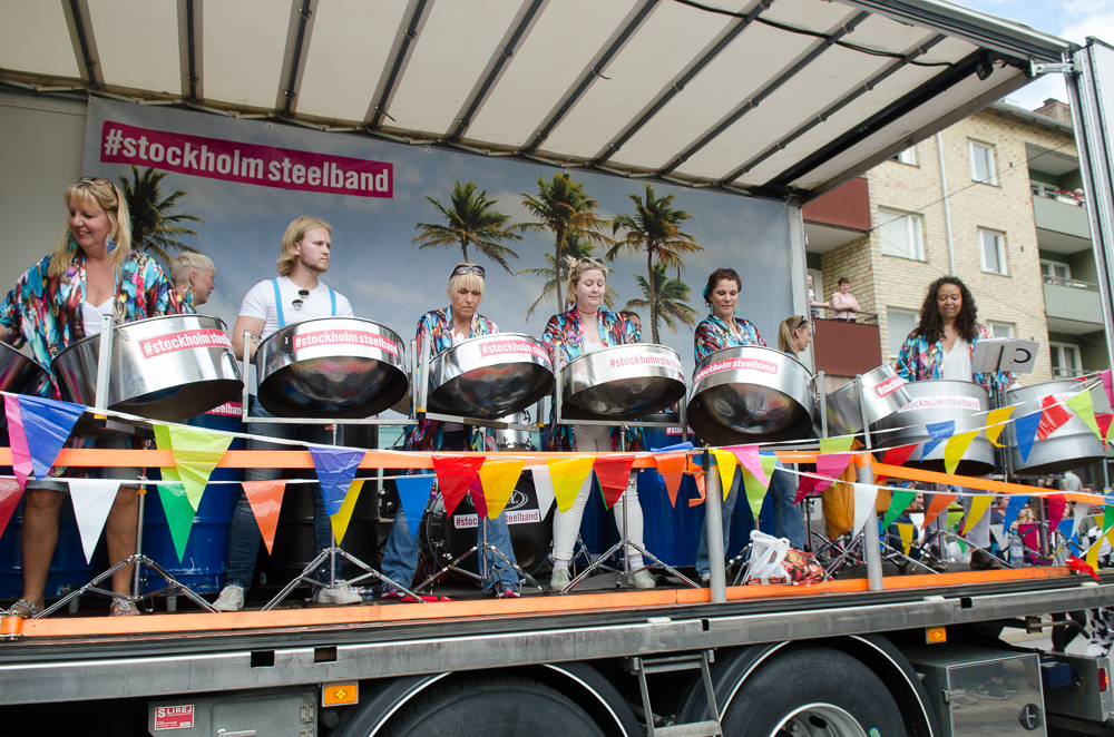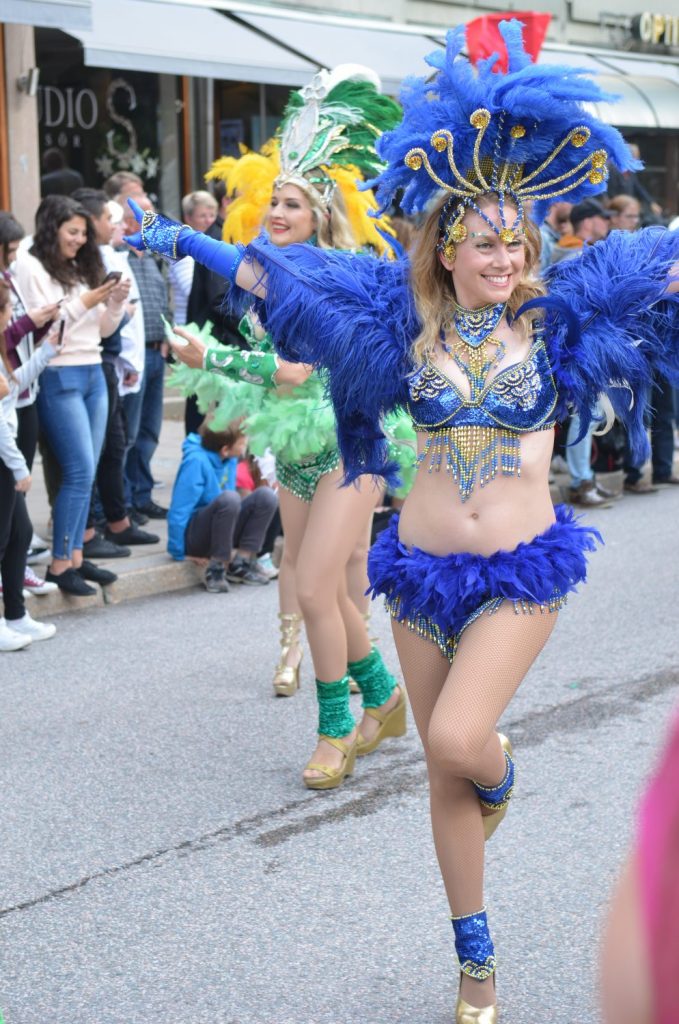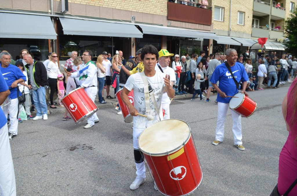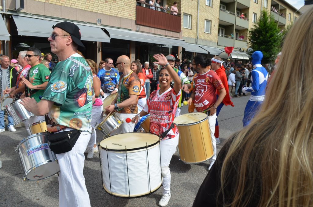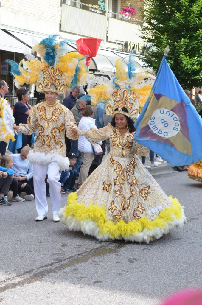 15:45 kommer det regn. Precis som utlovat. Vi tar plats efter huvudgatan i en port i skydd för regnet. Som ett trollslag så slutar det regna prick 16. Vi hör tåget på avstånd med starka trummor. Under cirka en timme går tåget genom stan med olika musik och dansgrupper.