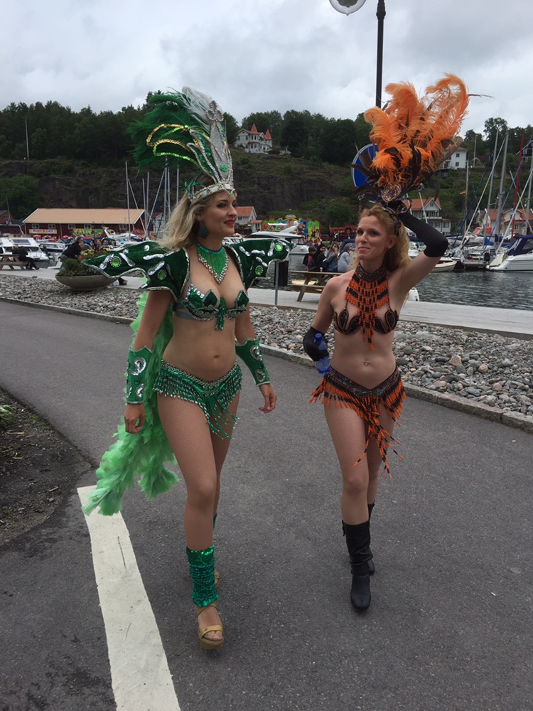 När vi vandrar runt på stan vid 15-tiden möter vi dessa två pinglor på väg till karnevals-tågs-start.