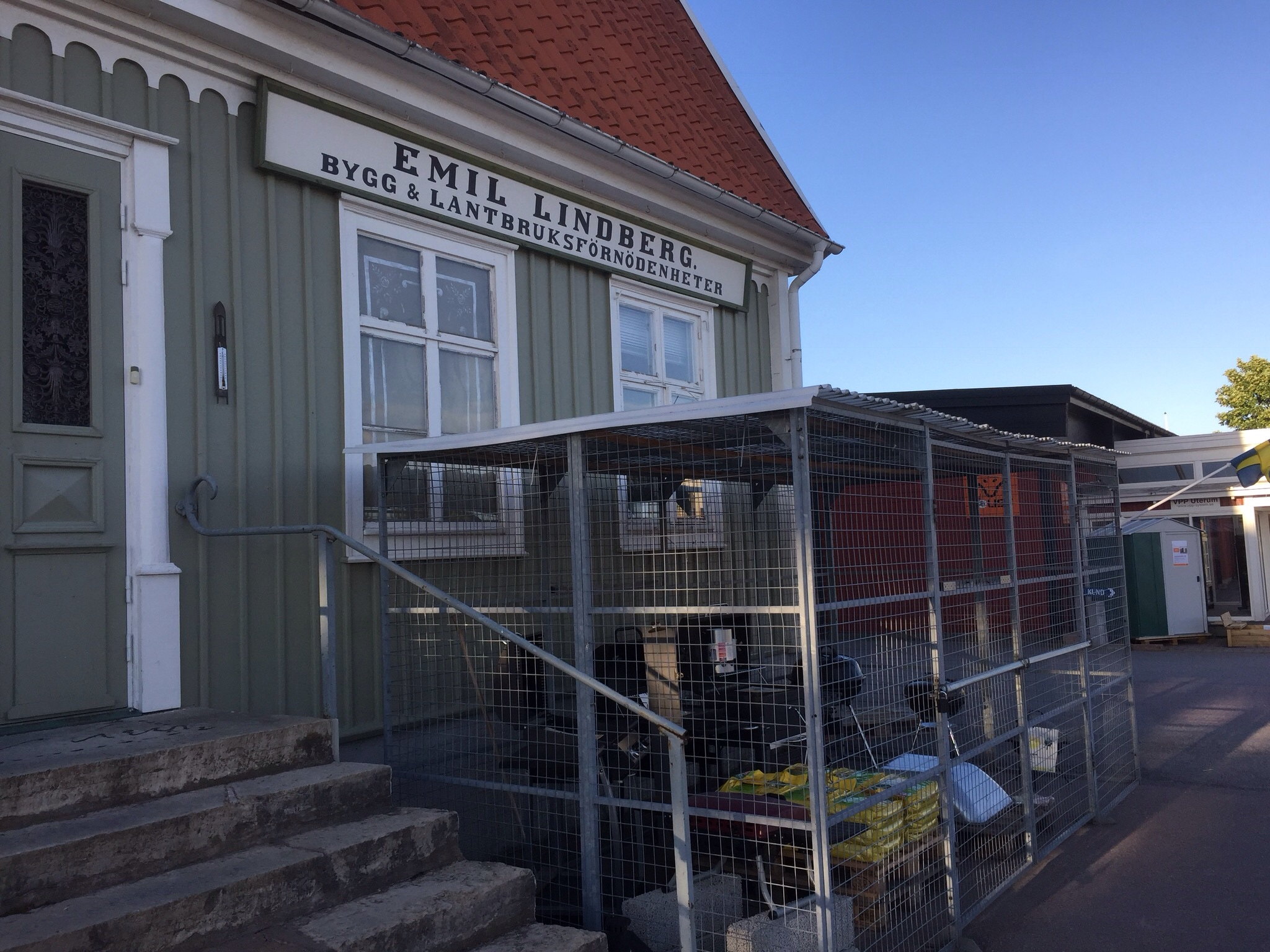 Vi tar en promenad runt Bergkvara. Finner denna gamla fina butik… Det finns en hel del gamla hus och spår efter svunna tider på den lilla orten, här och var vid de olika husen finns små tavlor som berättar om vad huset en gång varit och vem som bott där. Det hade varit roligt om man vid campingen hade någon sorts karta över den lilla byn så man visste hur man hittae och vad man kunde se.