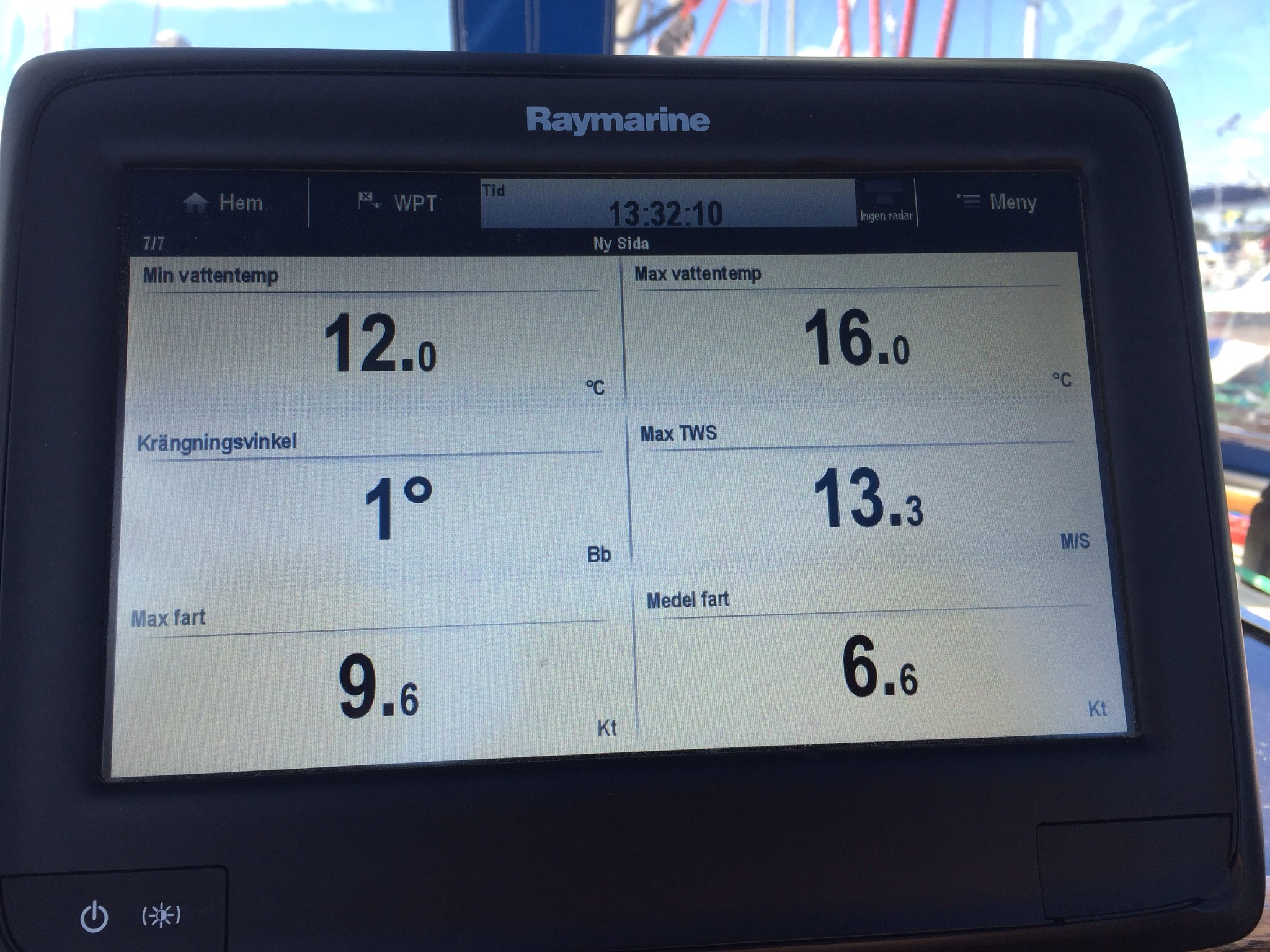 Frisk väst. Vi får halvvind och sträckbog till Bergkvara. Seglingen blir frisk med upp till 13m/s i byarna och bra fart trots att vi har ett rev och lilla focken som vi rullar in lite på slutet.