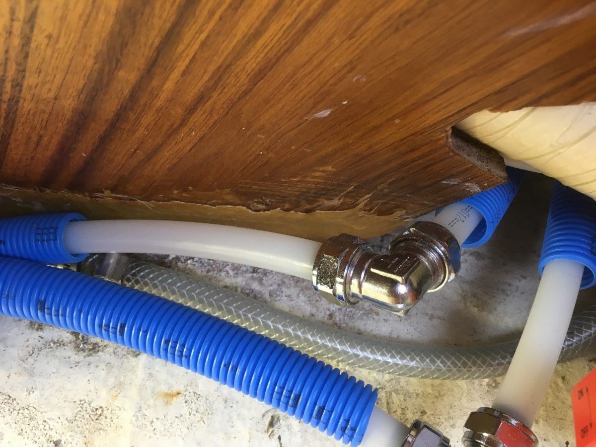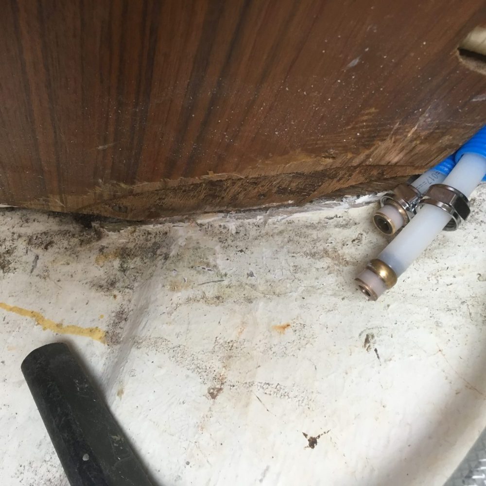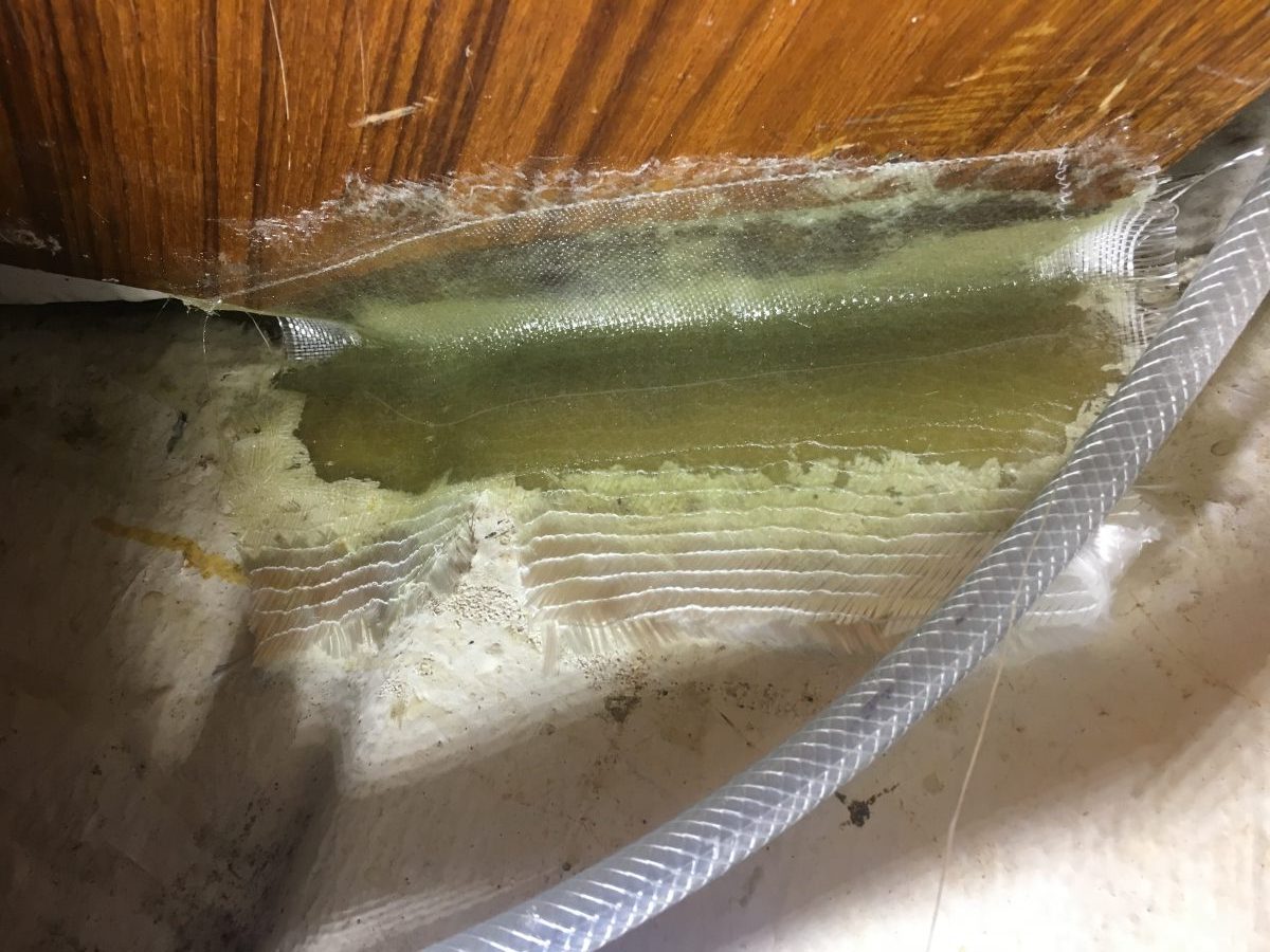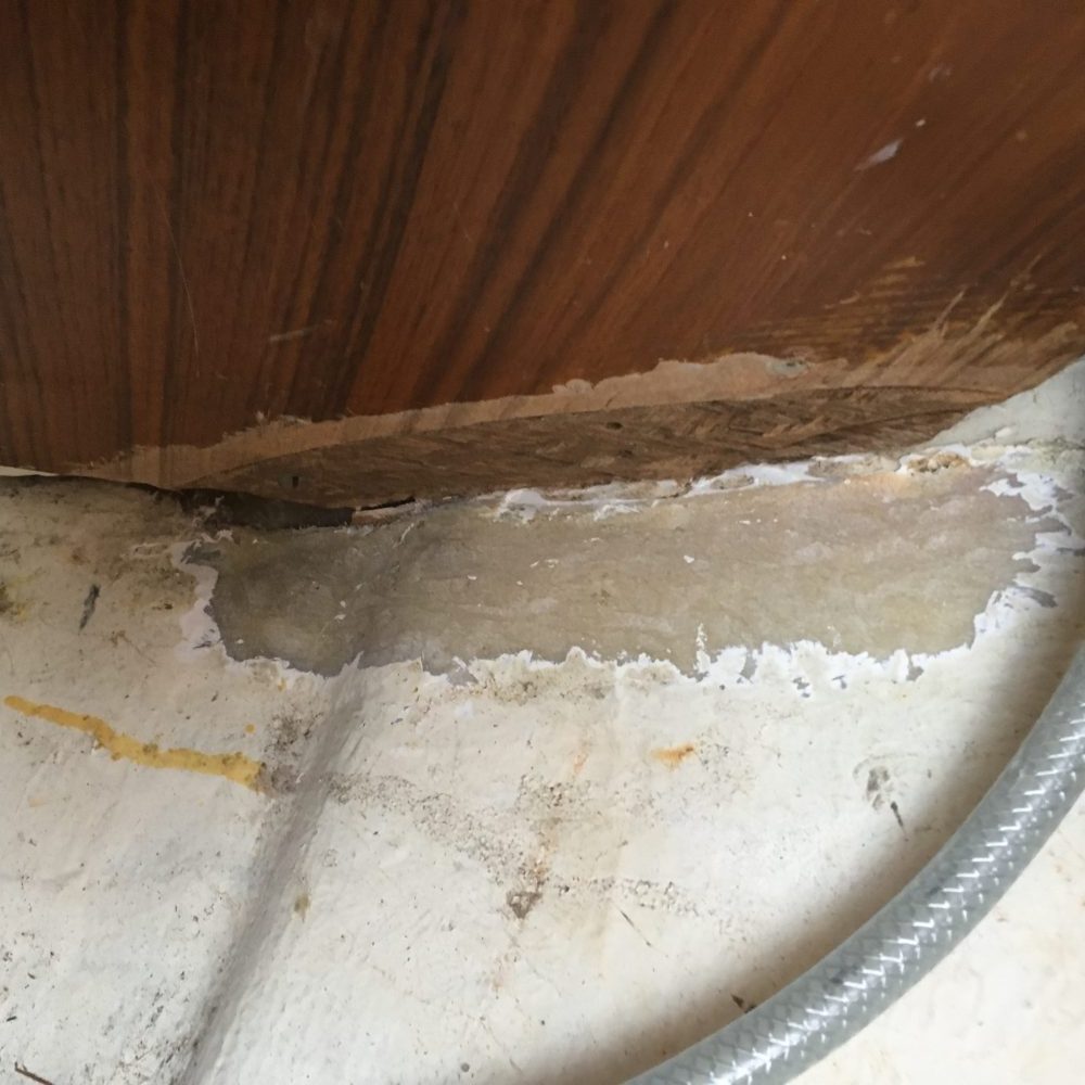 Vi hade en grundstötning för några år sedan vilket fodrade lite plastning i kölbalkarna. Men jag har senare hittat ett ställe som vi missat. Det är skottet akter om toaletten som släppt i plastningen inne i sjögarderoben. Man kan se att hela plastningen släppt från skottet.