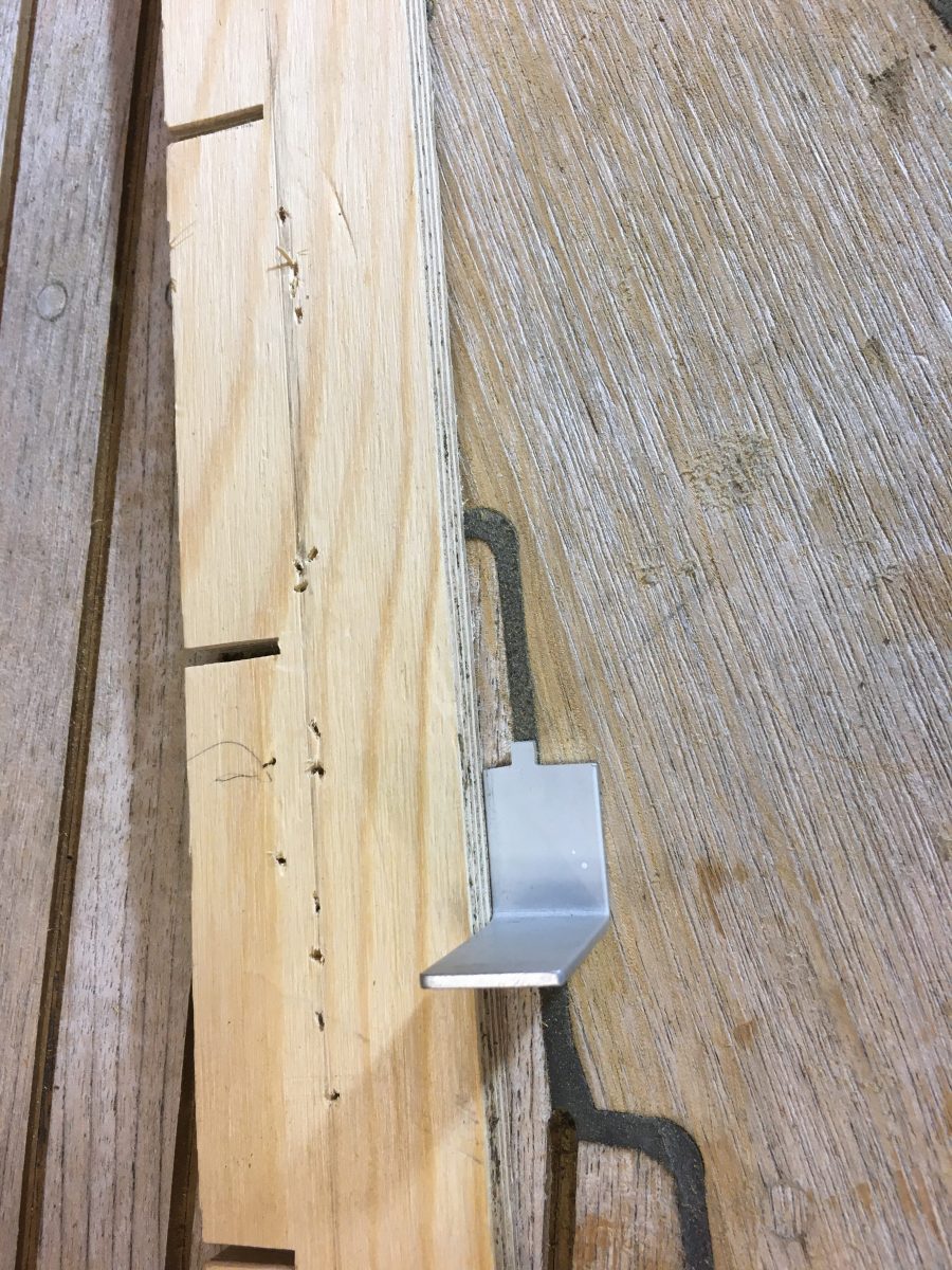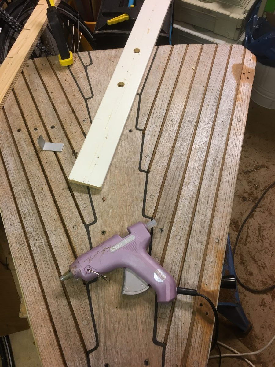 Nu provade jag att över långa bitar spika fast listen i nåten bredvid. Där kommer spikarna inte att synas när allt är klart. På korta bitar så använde jag en list med hål i och ”punkt-svetsade” den med smältlim ner i hålen.