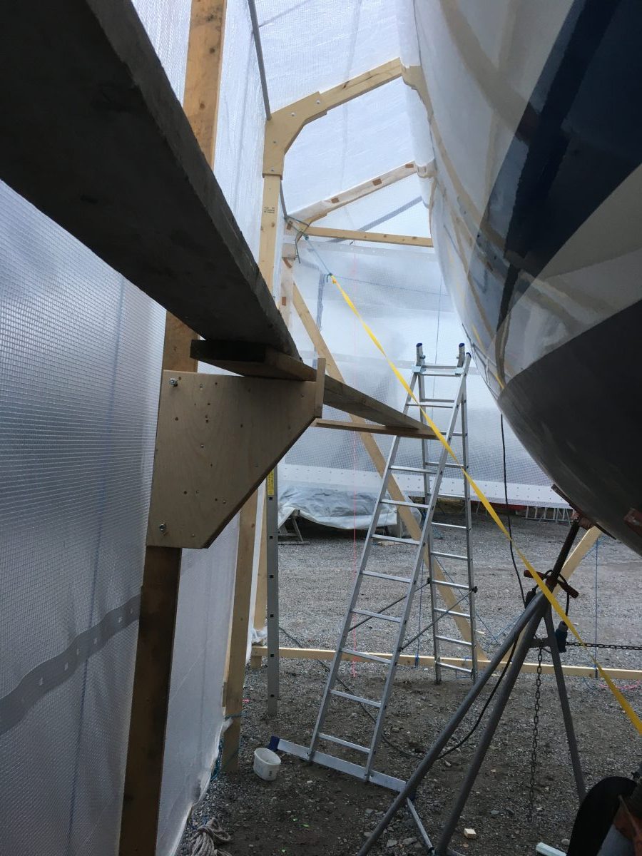 Söndagen ägnades åt att göra en bra spång vid sidan av båten för att kunna arbeta ifrån. När båthuset byggdes så köpte jag en stege på Biltema som kunde bli 5,1m hög och också bilda en A-stege. Som kunde användas som stöd för brädgången.