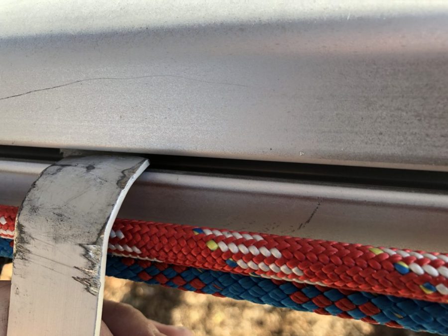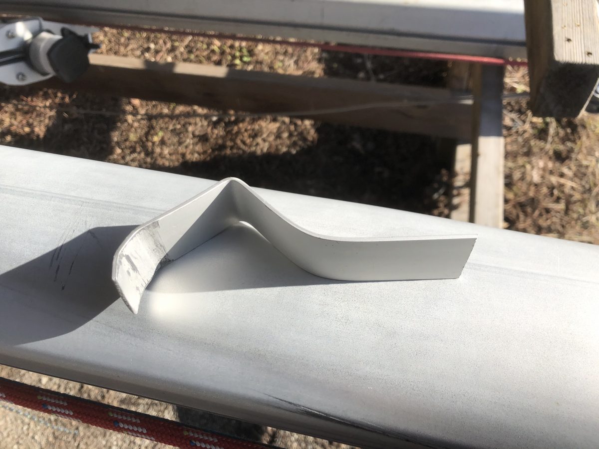 De befintliga kuddarna måste först tas bort. Masten läggs på sidan så att kablarna ligger nedåt. Jag har sedan tidigare gjort ett specialverktyg för detta. En tillbockad aluminium plåt.
