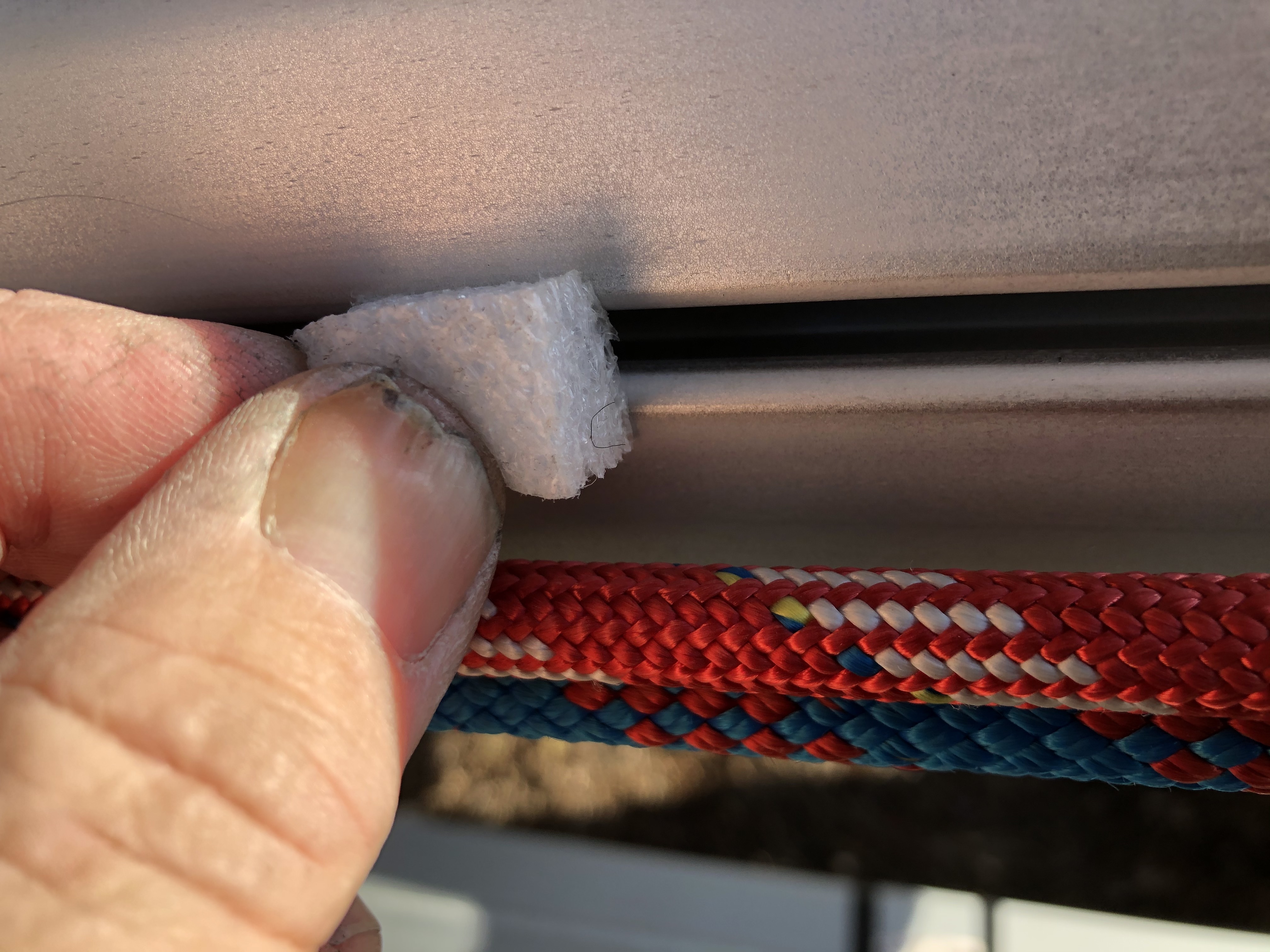 Sedan tar man kortänden på verktyget och pressar in kudden i kabelkammaren. Den nya kabeln ville inte komma ner riktigt vilket berodde på att det fortfarande fanns gamla kuddar kvar i kabelkammaren. Kabeln fick lyftas upp i likrännan och alla gamla kuddar rensades bort. Jag fick ut 6-7 stycken till. Nu gick det lättare att få ner kabeln och de nya kuddarna kom på plats med ca 400mm mellanrum. Nedan ser man i segelintaget hur kuddarna hamnar