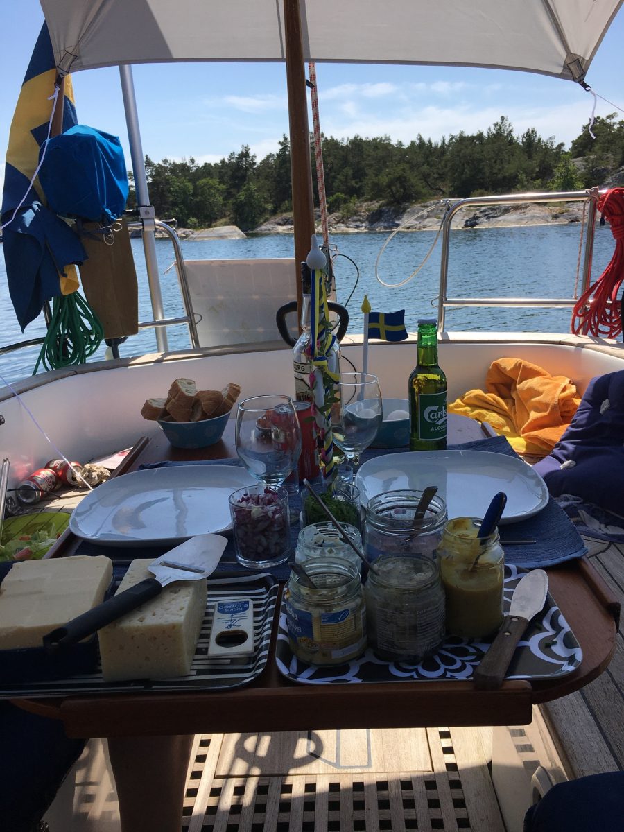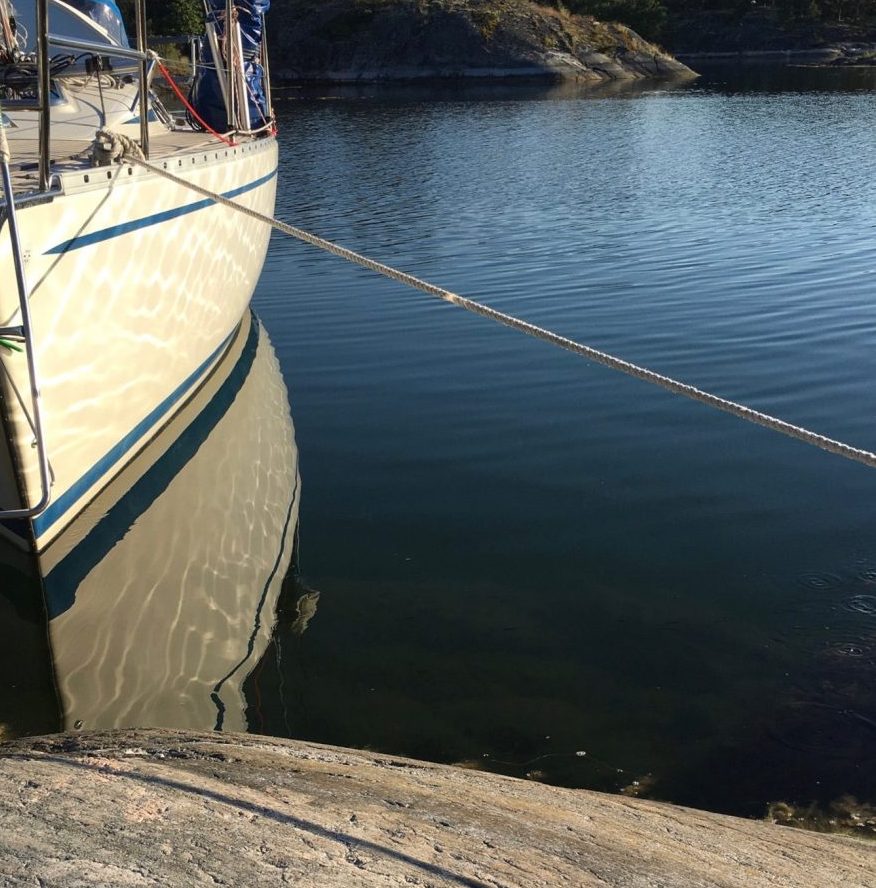 Vi avseglar från Småängsviken vid 15-tiden och seglar en timme. Sedan dör vinden ut och vi tar till motorn. Vi har en plan att hitta någon bra natthamn öster om Nämdö. Vi hittar efter några försök ett eget berg på Böteskobben. Inte en båt i sikte. ”Är det möjligt en midsommarhelg i Stockholms Skärgård”? Tydligen!