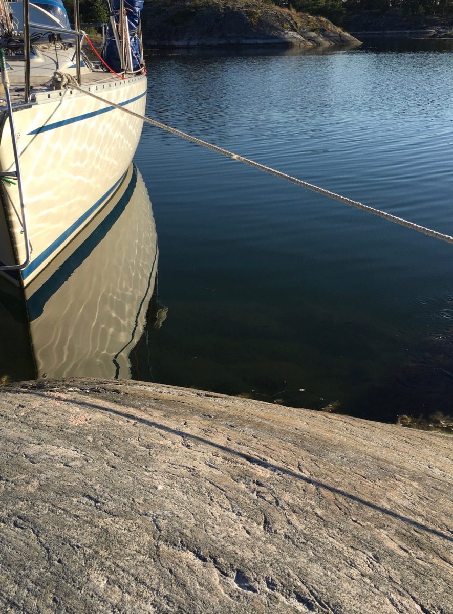 Vi avseglar från Småängsviken vid 15-tiden och seglar en timme. Sedan dör vinden ut och vi tar till motorn. Vi har en plan att hitta någon bra natthamn öster om Nämdö. Vi hittar efter några försök ett eget berg på Böteskobben. Inte en båt i sikte. ”Är det möjligt en midsommarhelg i Stockholms Skärgård”? Tydligen!