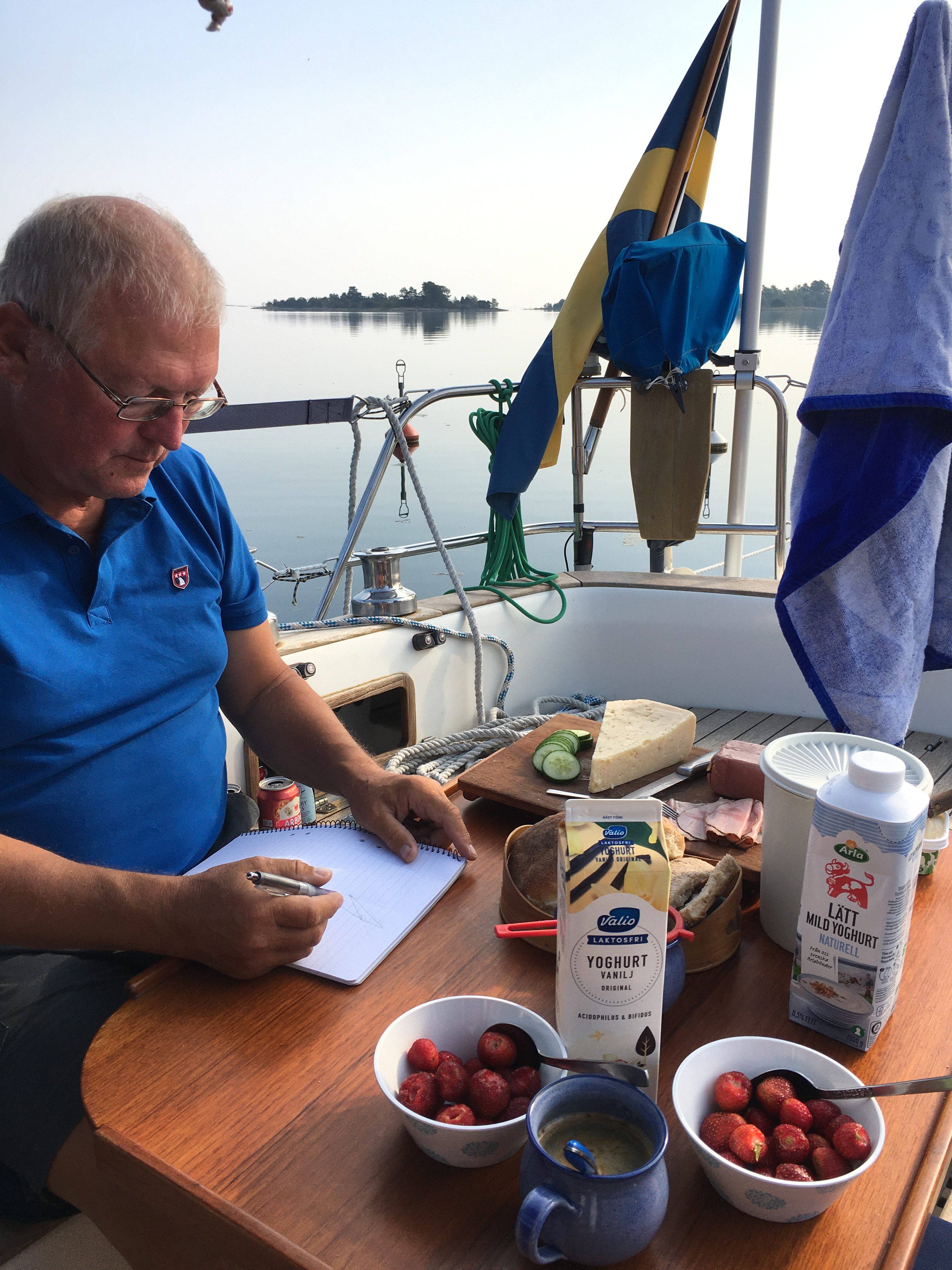 Det är rekordvarmt i vattnet – 22,4 och det kan man ju inte motstå innan vi tänder grillen och tillagar kvällens middag som består av grillad filé, potatisgratäng, sallad och bea, allt efter födelsedagsbarnets önskemål senare avslutas middagen efter en kvällspromenad med kaffe, te och gräddtårta med ölandsgubbar.