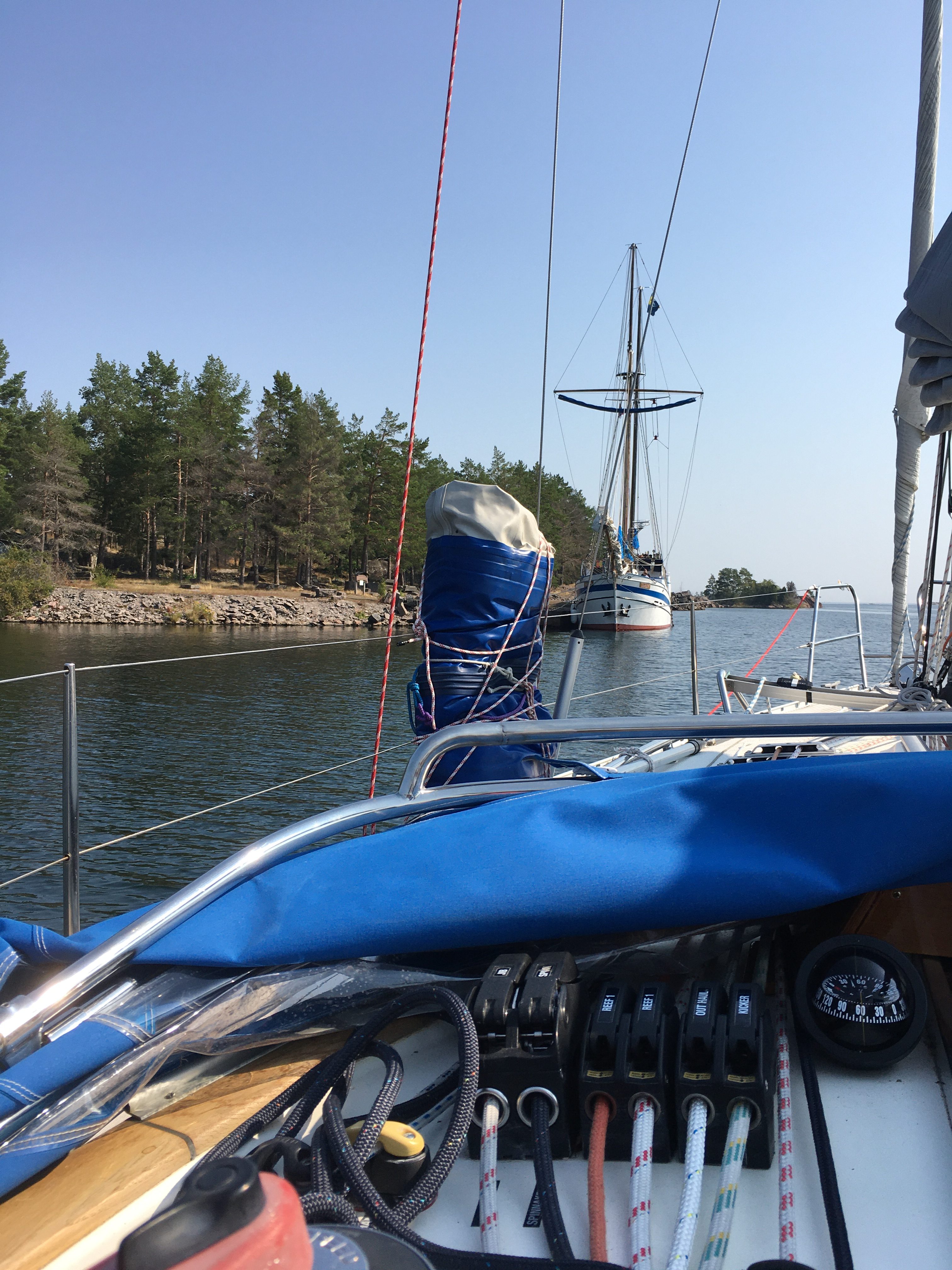 Efter leden vid Stångehamns Ö kan vi hissa segel och segla mot Rådskär och leden till Figeholm, precis när vi tar ner seglen kommer en gammal träbåt med ångmotor förbi oss och går före in i leden, det ryker plötsligt väldigt mycket om den båten och vi funderar på om det är något fel på den, det gör andra också visar det sig för vi blir upphunna av en motorbåt som frågar oss om vi tror att de behöver hjälpa till på något sätt…