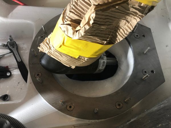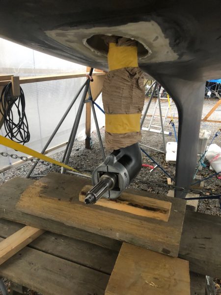 Vi kommer fram till att man kan slipa lite hålets bakkant för att få mer plats för propelleraxeln. Efter detta så går det precis att få ner riggen.