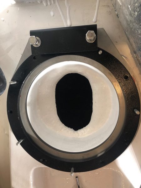 Därefter var det dags att lägga Sikaflex på ytan. Då upptäcker jag att jag glömt patronsprutan hemma. Jag får trycka ut Sikan för hand och spackla ut allt. Sedan bultade jag fast adaptern med 8st Försänkta M10