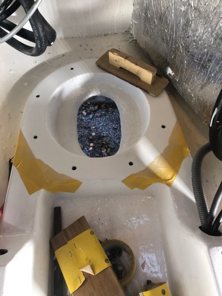 Jag tejpar lite skyddspapper på riggen och så gör vi ett försök. Drevet går inte ner i hålet! I bakkant tar det i basinredet.