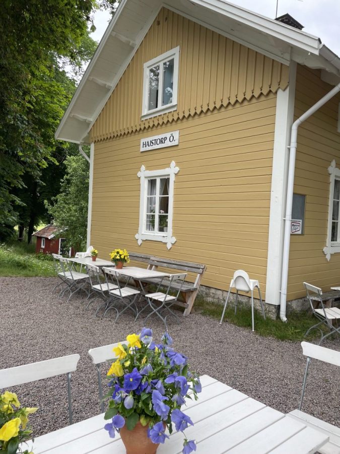 Tillbaka i båten började vi fundera på hur vi skulle fördriva resten av dagen och kom fram till att vi ville fortsätta till nästa sluss i Hajtorp, så vi lossade förtöjningarna, vände båten och puttrade iväg- det var inte lång väg och vi behövde bara passera två broar så hela resan tog inte ens en halvtimma. I Hajstorp låg bara en liten motorbåt så vi hade gott om plats att välja på och eftersom klockan närmade sig fem var det nog liten risk att det skulle komma flera. Hajstorp är inget stor ställe, här är i stort sätt bara två dubbelslussar, ett litet café där vi tog lite fika och glass och ett kafé som var stängt. Fåglarna kvittrar annars är här alldeles tyst. Och så var tvättstugan ledig, så jag slängde in våra smutsiga kläder och som alltid när jag är ute och provar andra tvättmöjligheter undrar jag: Hur lång tid kan en kulörtvätt ta, egentligen?
