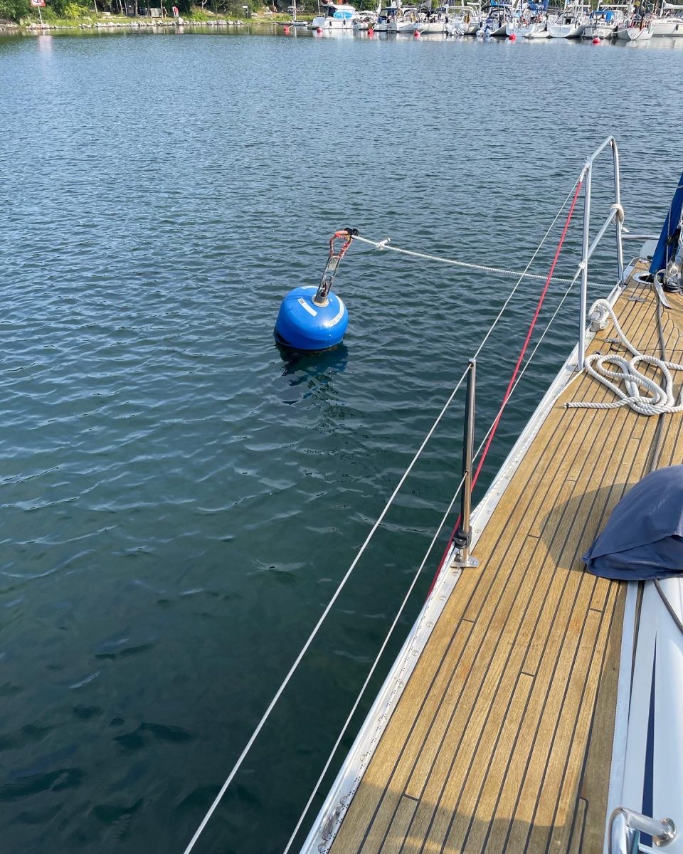 När vi åker vid halv tio är hamnen nästan tömd på båtar, vi är 5-6 stycken som åker ut som ett pärlband från Hanö och de flesta har kurs mot Karlhamn. Vi sätter segel så fort vi kommer ut från piren och får halvvind upp mot Tärnö, dit vi har sett fram emot att ligga på svaj i lä, där finns en kryssarklubbsboj- tänk om den är ledig den här gången också…. Det är bara ungefär 10 M till Tärnö från Hanö så det blir inte så lång segeltur, och vi behöver bara göra 2-3 slag innan vi kan smita förbi en tysk båt, gå igenom den röda och gröna och snabbt ta ner seglet när vi glider runt in i viken- det ligger en båt vid den blåa bojen, så vi bestämmer oss att svaja men när vi vikt klart seglet, åker den båten och vi är snabba att ta bojen – Hurra! Det känns som vi vunnit en tävling när den tyska båten kör förbi oss för att gå in till gästbryggan i stället, jag skyndar mig att leta rätt på bojflaggan, den har vi inte använt i år, så jag är lite osäker på vad den ligger….