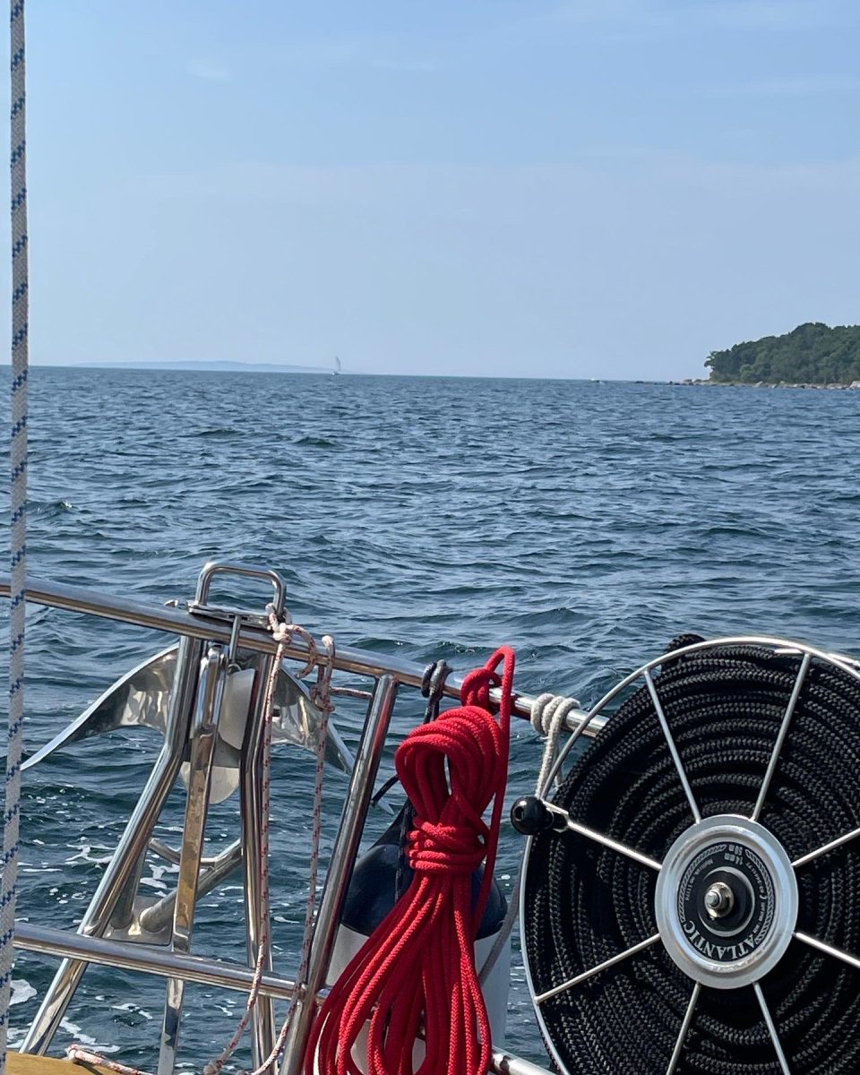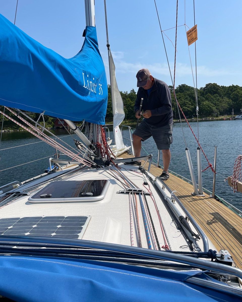 Vi har en ganska varm dag, Reidar bestämmer sig för att frosta av kylboxen, så vi tömmer den på allt som vi lägger i frysväskor, sen får vi vänta – över 2 timmar tar det innan all isen har smält och vi kan lägga tillbaka allt igen. Under tiden har Reidar lite andra sparade ”projekt för en vacker ledig dag” att pyssla med, det är bla att undersöka om vi har spänningsfall i solcellsladdningen, om det läcker i pumpen till ankarspolningen och annat smått och gott och så byter vi segel. Nu ska vi köra självslående fock ett tag- ni minns kanske att vi körde sönder en fock och fick ett reservsegel levererat till Göteborg? Nu är det hög tid att se hur den fungerar. Jag kan passa på här och nu att avslöja att seglen vi har just den här semestern kommer att bli till salu när vi kommer hem. Det är redan en ny fock beställd och kaptenen har visst långt framskridna planer på ett nytt storsegel också….