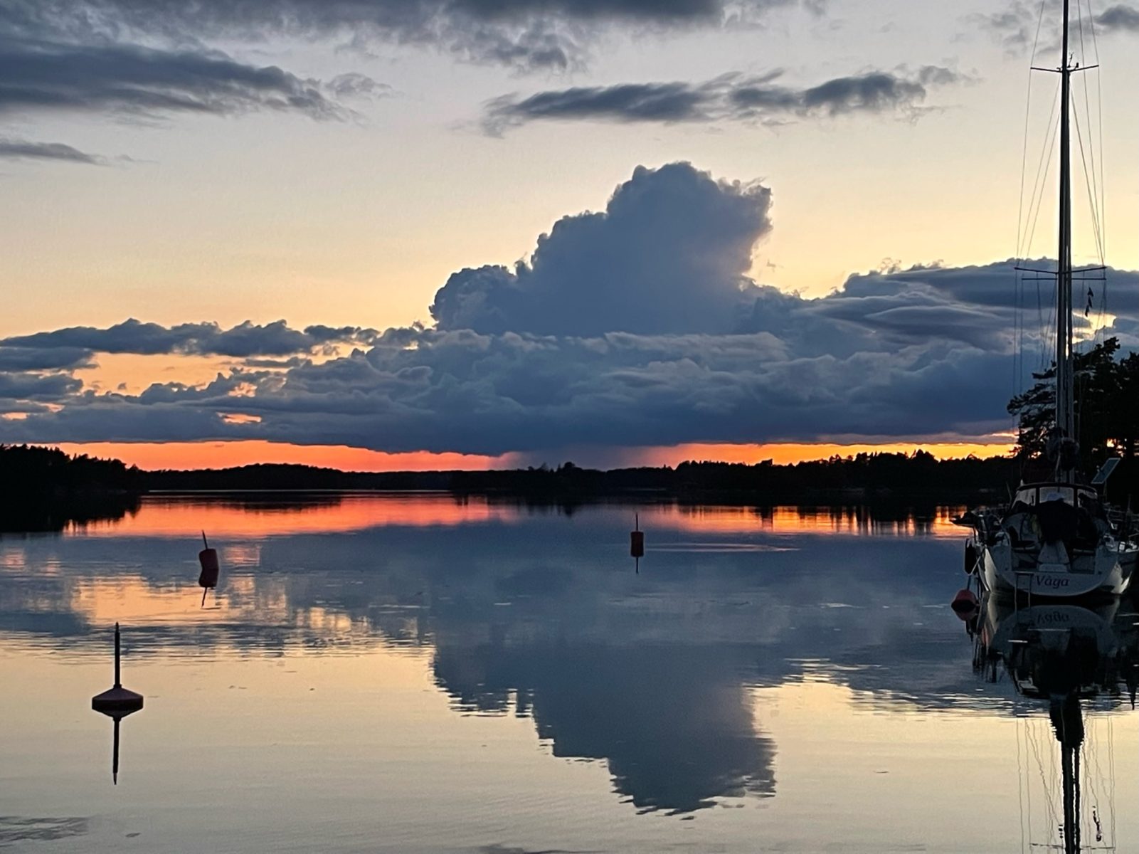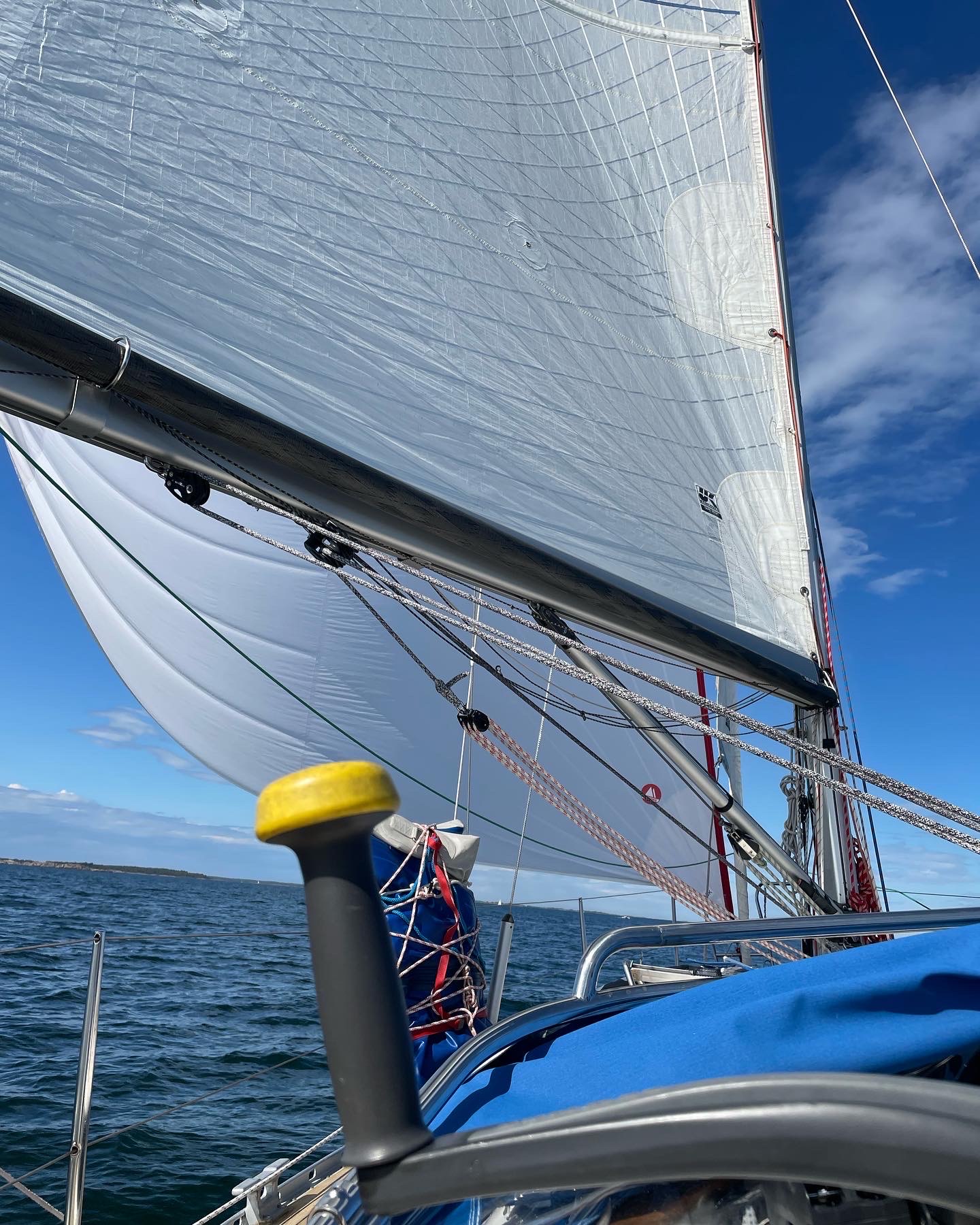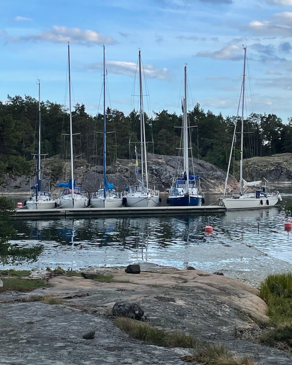 Det visar sig att vinden inte är så svag trots allt när vi kommer ut i leden, så vi hissar vårt Code one segel för att få lite bättre fart och kommer upp i en hastighet av 4 knop, och vi lyckas segla med samma segel hela vägen till Rågö. Vid Rågö finns två bryggor och många bojar, vi får en plats på nocken där vi tycker att vi ligger bra.