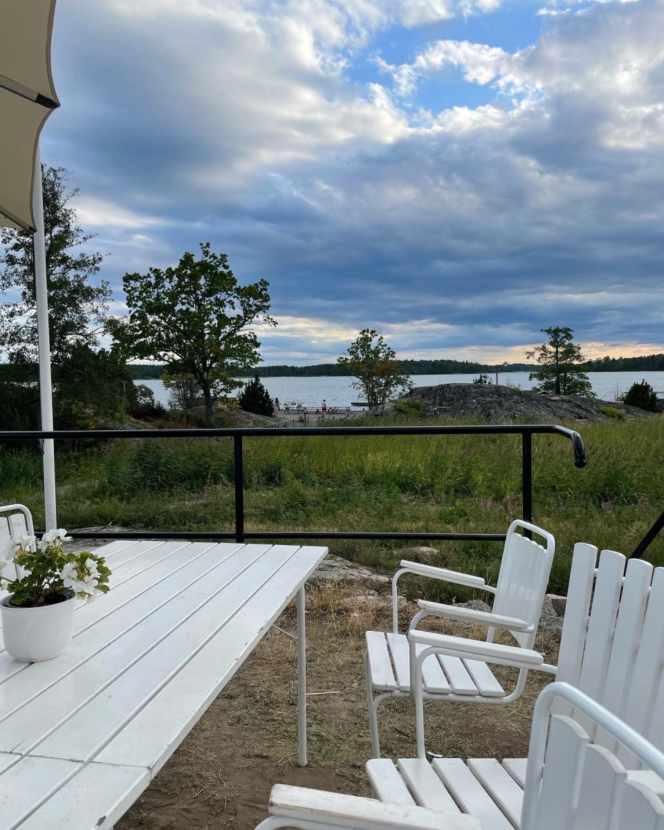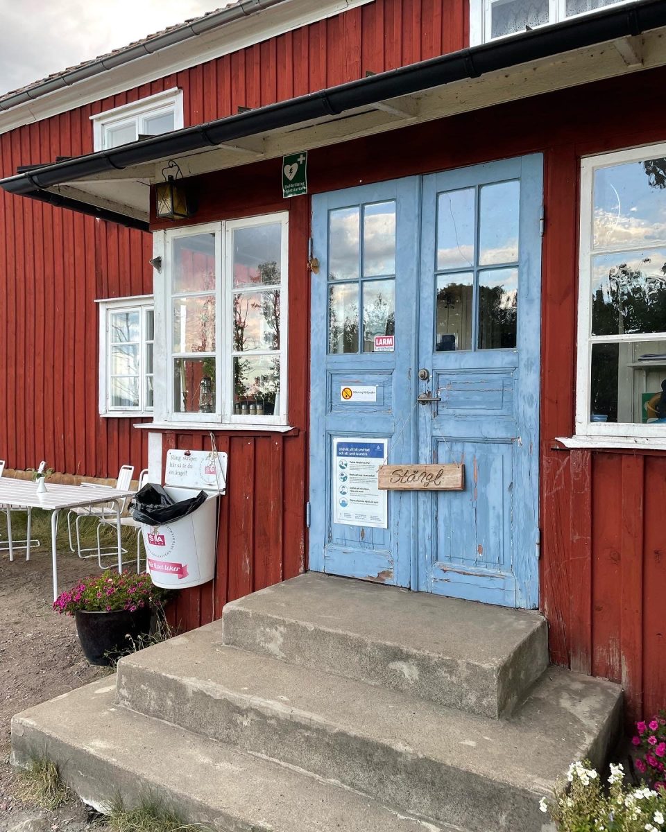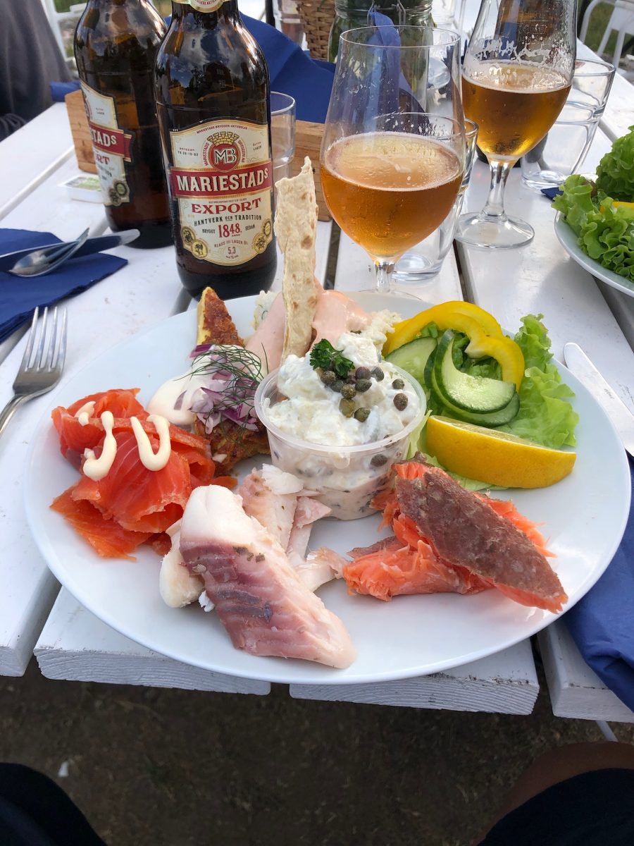 Serveringen är i ett litet gammalt torp och har möjlighet att sitta ute och där slår vi oss ned. Men- de har inga räksmörgåsar – så det får bli någon annat att äta, för min del blir det en vegetarisk hembakad paj och räkmackeälskaren fick istället njuta av en skärgårdstallrik. Den såg inte ut att vara helt fel den heller. Vi får sitta kvar vid vårt bord fast personalen slutar för dagen, vi har en trevlig stund med mycket snack och skratt…
