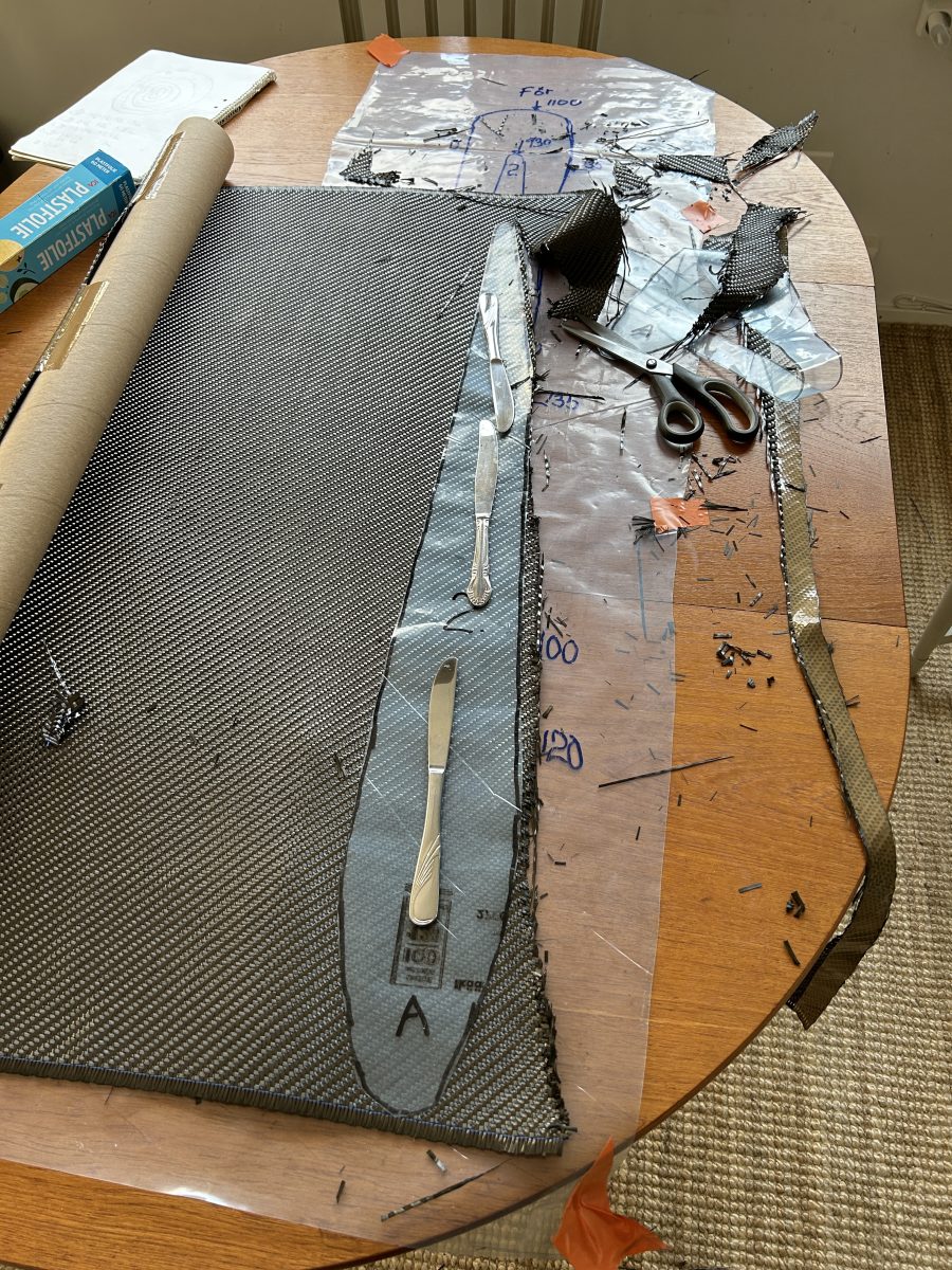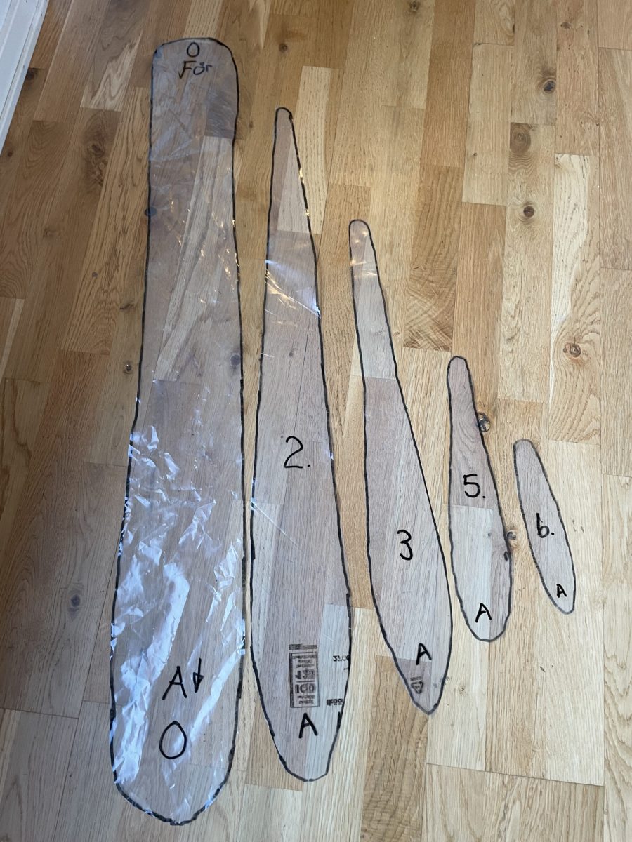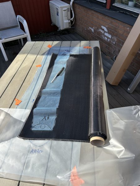 Därefter klippte jag ut bitar i båda dukvikterna efter dessa mallar. Jag hade gjort lite beräkningar på tjocklek där 1000g/m2 ger ungefär 1mm laminat. Kombinerar man 200g och 600g så kan man variera tjocklekn
