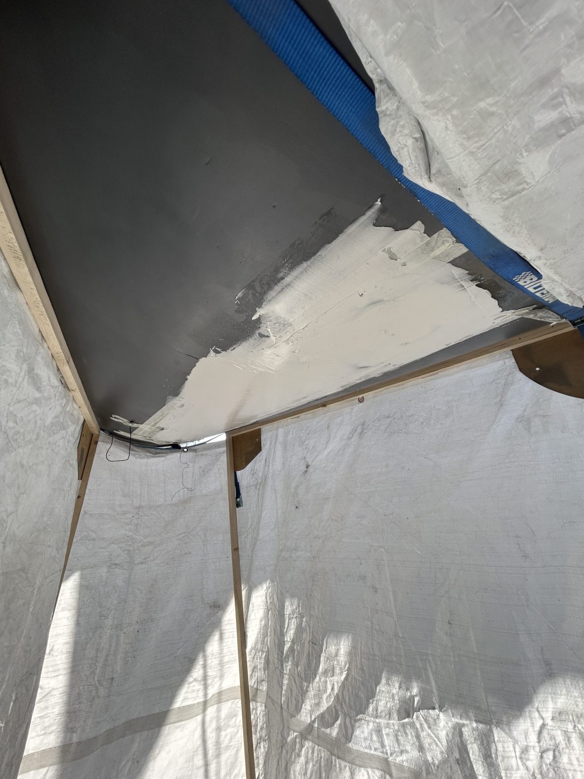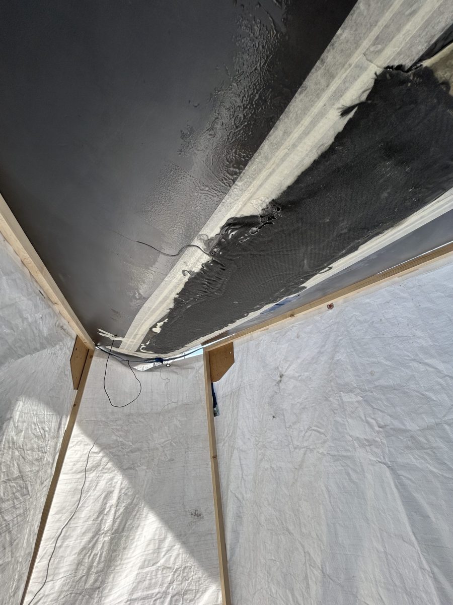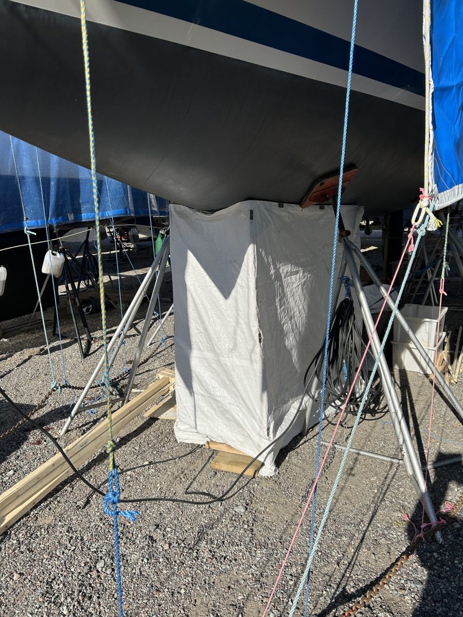 Efter lite inköp av material, kolfiber, epoxi och peelply så började det dra ihop sig för att förstärka botten. Jag fick rådet att försöka hålla 15º C både utvändigt och invändigt i skrovet. För att uppnå detta i mars så byggde jag ett litet ”hus” under reparationsstället.