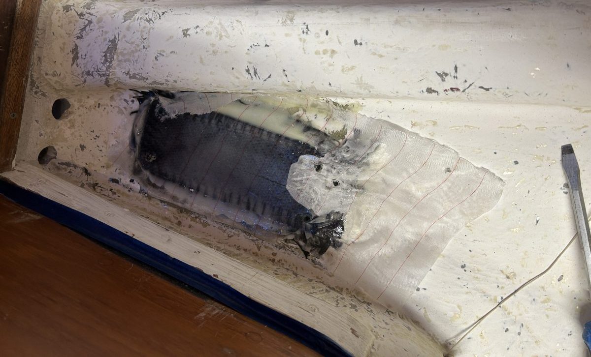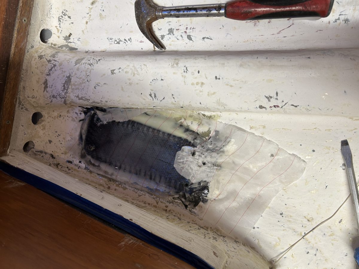 På insidan var det dags att återmontera mastfoten. Den var lite bananformad men har rätats ut med hjälp av gasollåga 300º och en tving. Ytan i skrovet behövd jämnas till så där lade jag förtjockad epoxi och en bit 600g kolfibermatta. Mastfoten kläddes med plast och skruvades fast i den våta epoxin med en bit pelply mellan och fick härda så.