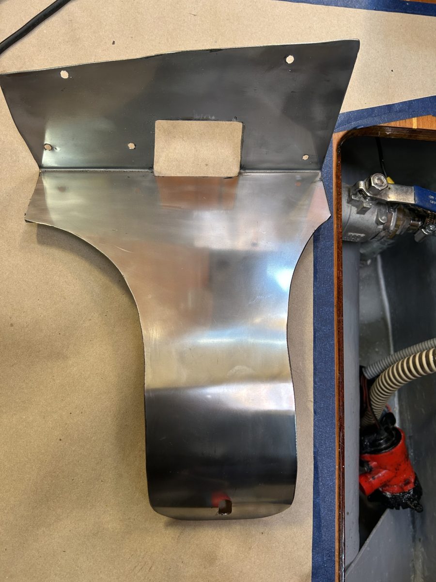 Plåten skulle bockas i 90º i botten. Inte helt lätt utan rätt verktyg/maskin. Jag gick och klurade på detta under någon vecka och fick lite tips av kunniga båtkompisar. Men det slutade med att jag åkte ner till Kjellqvist Mekaniska som ligger i närheten och på ett kick så hade jag fått hjälp att göra en fin 90º bock på rätt ställe. Jag gjorde en mall av kölsvinet där det sitter muttrar och brickor. För dessa måste hål tas ut i plåten. Efter bockning, tillkapning och borrade hål för pump och sensor så såg det ut så här.