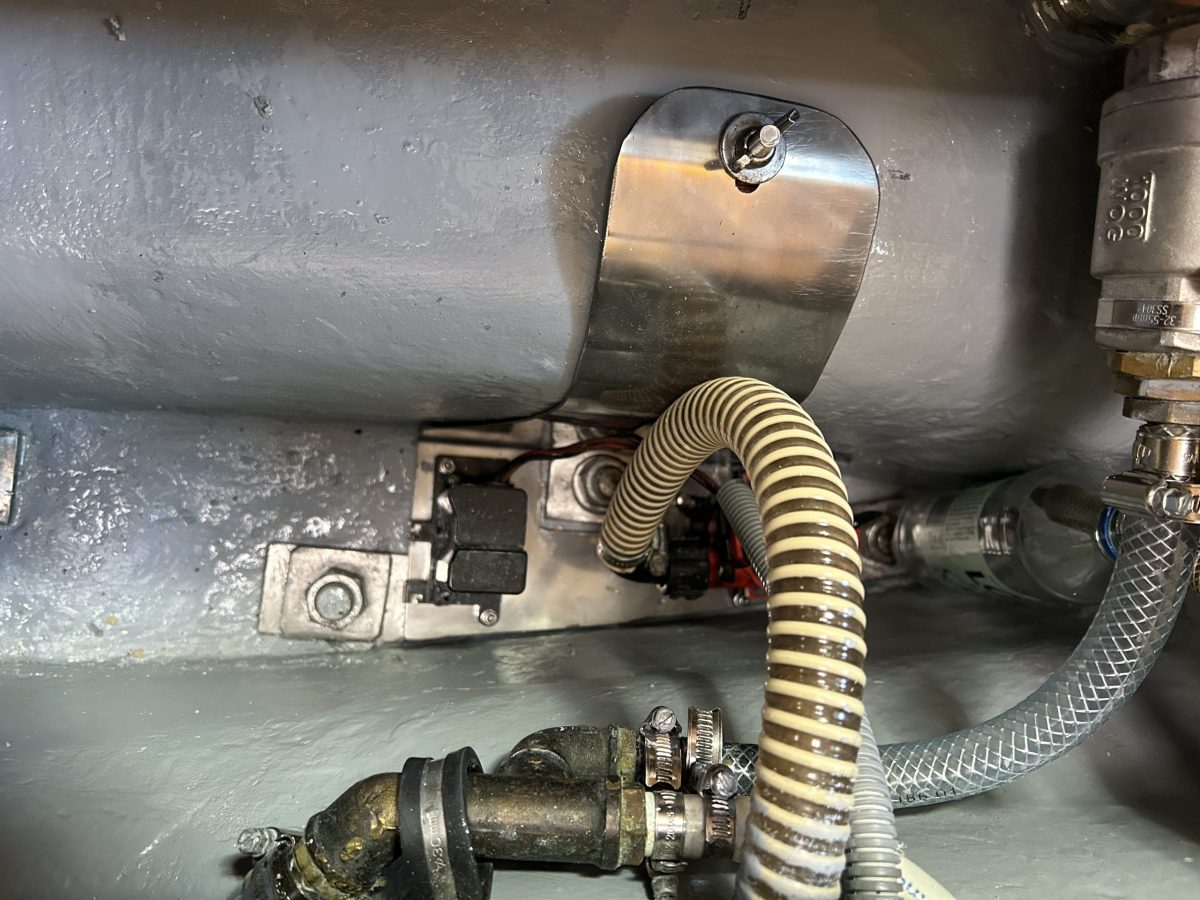 Pumpen och sensorn har varit fastskruvade i botten på kölsvinet längst akterut. Därför har det inte gått att komma ner där för att göra rent.