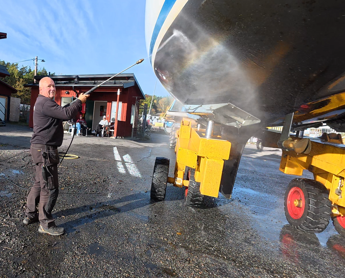 Nu kan man spola i stort sätt hela båten och alla utrymmen. Som test tvättade jag skrovet där högtryckstvätten inte kom åt då båten stod på upptagningsvagnen. Fungerade alldeles utmärkt.