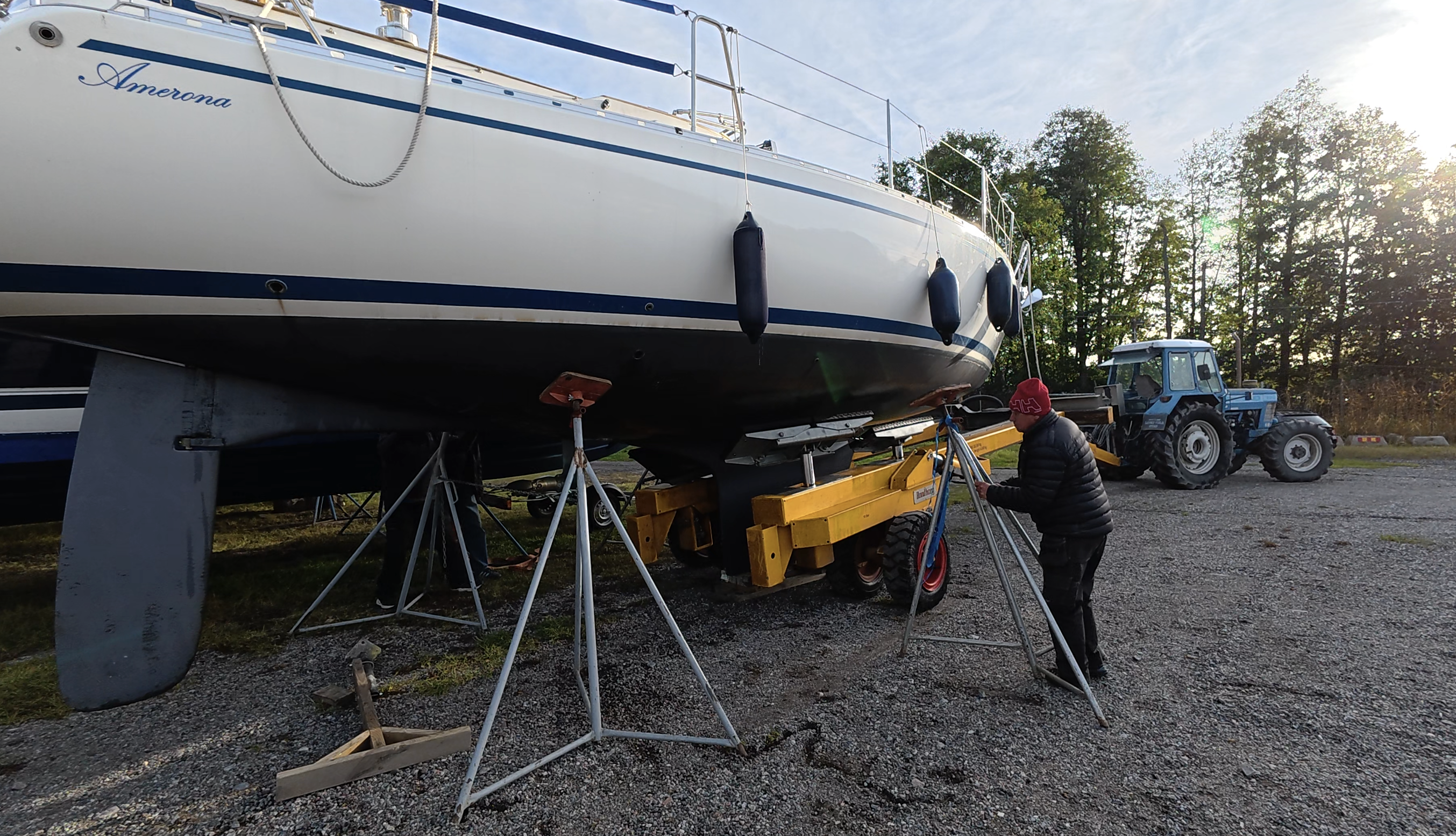 Amerona står nu på land sedan någon vecka. Täckt och delvis polerade fribord. Motorn är konserverad men jag har fortfarande vatten kvar i vattentanken. 170 liter. Detta vatten har jag tänkt använda för tvätt av botten och att städa kölsvinet.