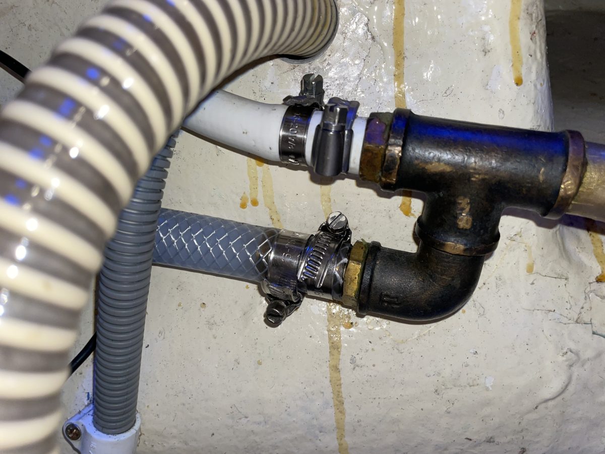 Efter den sitter en fördelning där den vita slangen går upp mot pentrypumpen, där det nya T-stycket nu sitter. Den andra delen går fram till fören där spolpumpen sitter under stick-kojen