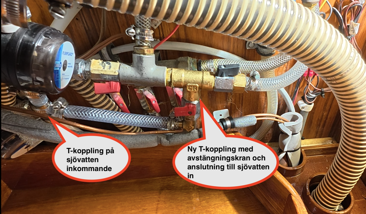 Nu skruvads den högra kranen bort och ytterligare en T-koppling adderades. Så nu har vattnet sitt flöde enligt nedan. Den nya T-kopplingen med balofix länkar färskvattnet till slangen med inkommande sjövatten. Där kapade jag inkommande slang och satte ett T-stycke i plast.