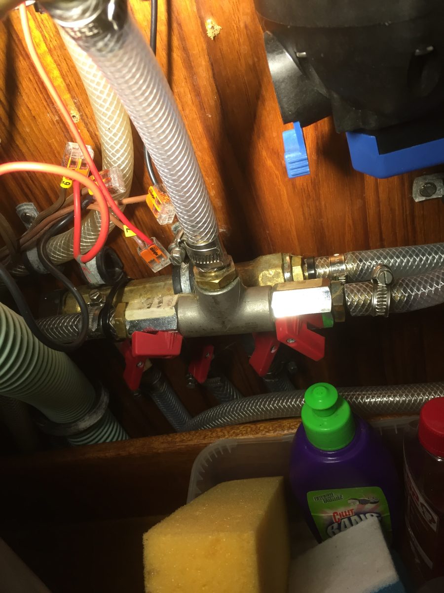 Så här såg kopplingen på färskvattnet ut från början. Färskvatten från tryckvattenpumpen kommer ner i T-kopplingen, slangen i mitten och fördelas till höger upp till pentrykranen och till vänster till VV-beredare, toalettutrymme och duschar (en på toaletten och en i sittbrunnen). Balofixer för avstängning.